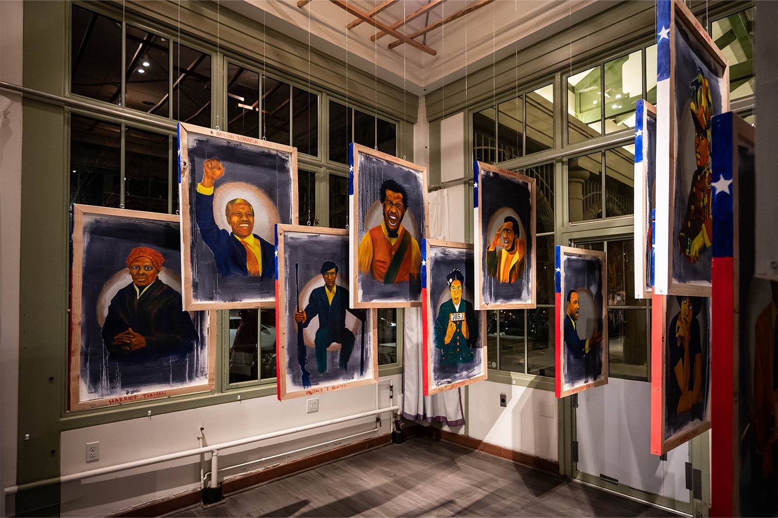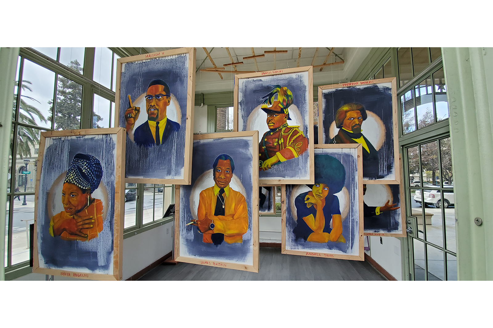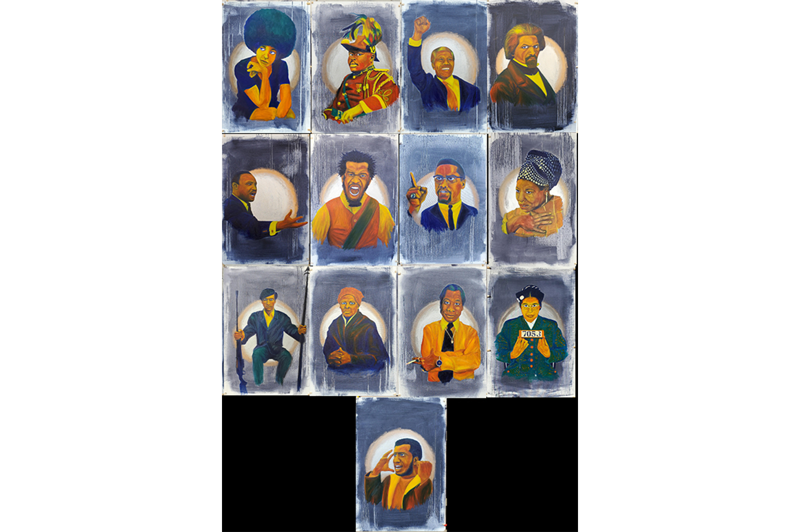 “A Difficult Conversation”, for me as a Black artist, hints towards the conversation our nation is currently involved revolving around systemic racism. I painted 13 portraits using only primary and secondary colors in a value order set from lightest to darkest. Accented with metallic gold and silver using bold strokes. These figures, Black leaders such as Harriet Tubman, Angela Davis, Marcus Garvey, Nelson Mandela, James Baldwin, and others, will pose with gestures and motions of hope, and a positive outlook towards the future. On the reverse side of my portraits of Black famous pioneers, both internationally known and studied throughout history, are 13 portraits of everyday African Americans who have lost their life due to systemic racism. These headshot portraits, similar to the large attractive portrait busts displayed during funerals and wakes, depict faces exuding confident and pleasant demeanors painted with hues ranging from black to white.