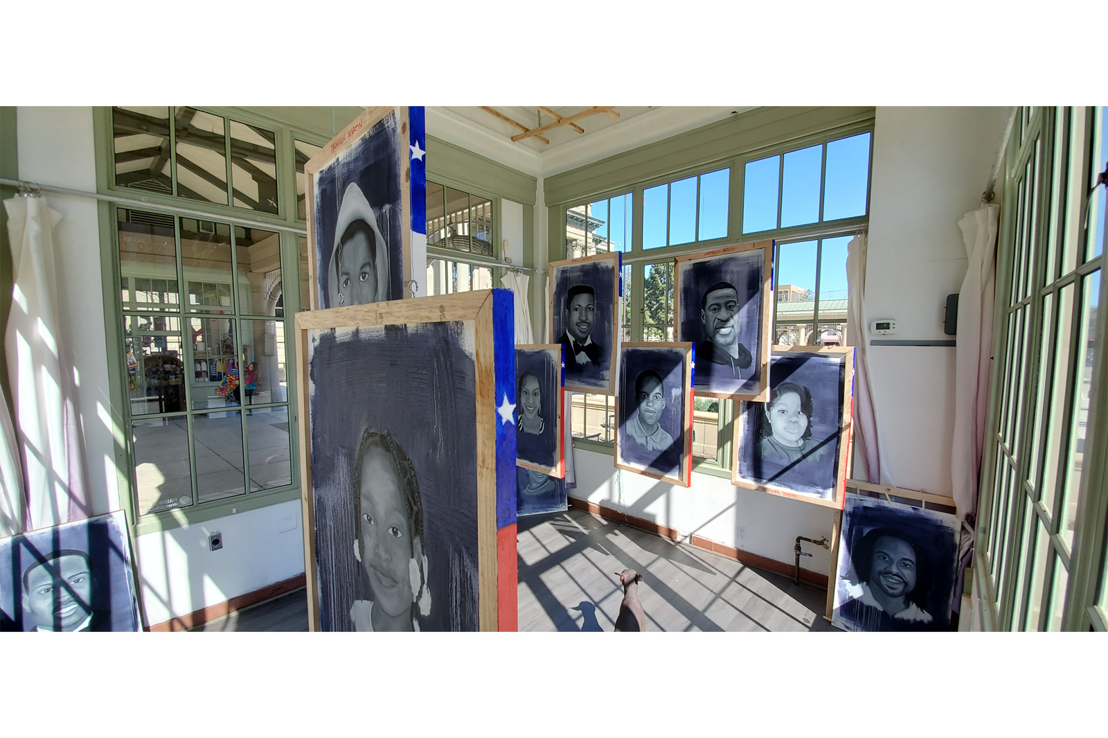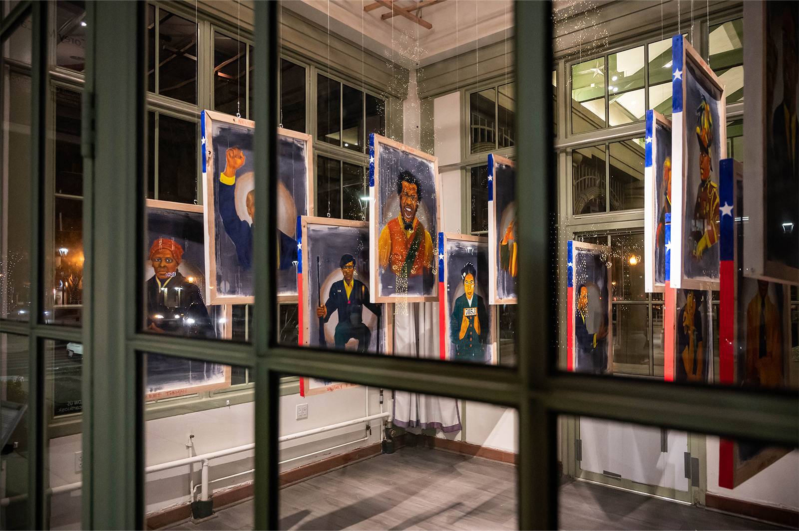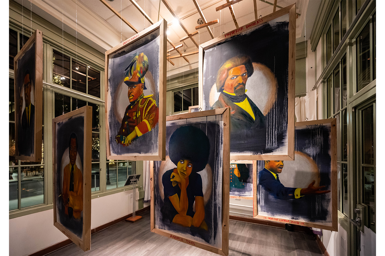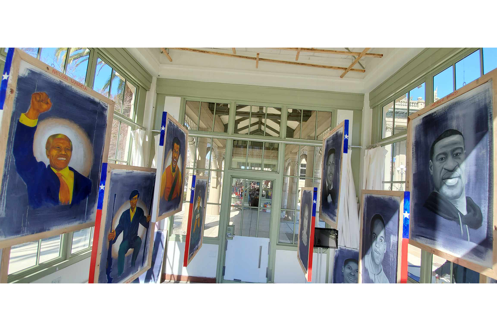 “A Difficult Conversation”, for me as a Black artist, hints towards the conversation our nation is currently involved revolving around systemic racism. I painted 13 portraits using only primary and secondary colors in a value order set from lightest to darkest. Accented with metallic gold and silver using bold strokes. These figures, Black leaders such as Harriet Tubman, Angela Davis, Marcus Garvey, Nelson Mandela, James Baldwin, and others, will pose with gestures and motions of hope, and a positive outlook towards the future. On the reverse side of my portraits of Black famous pioneers, both internationally known and studied throughout history, are 13 portraits of everyday African Americans who have lost their life due to systemic racism. These headshot portraits, similar to the large attractive portrait busts displayed during funerals and wakes, depict faces exuding confident and pleasant demeanors painted with hues ranging from black to white.