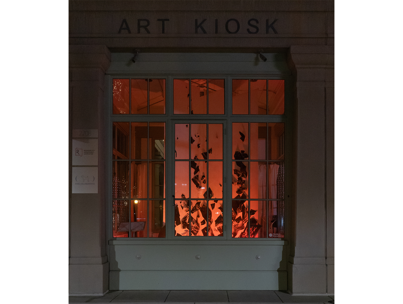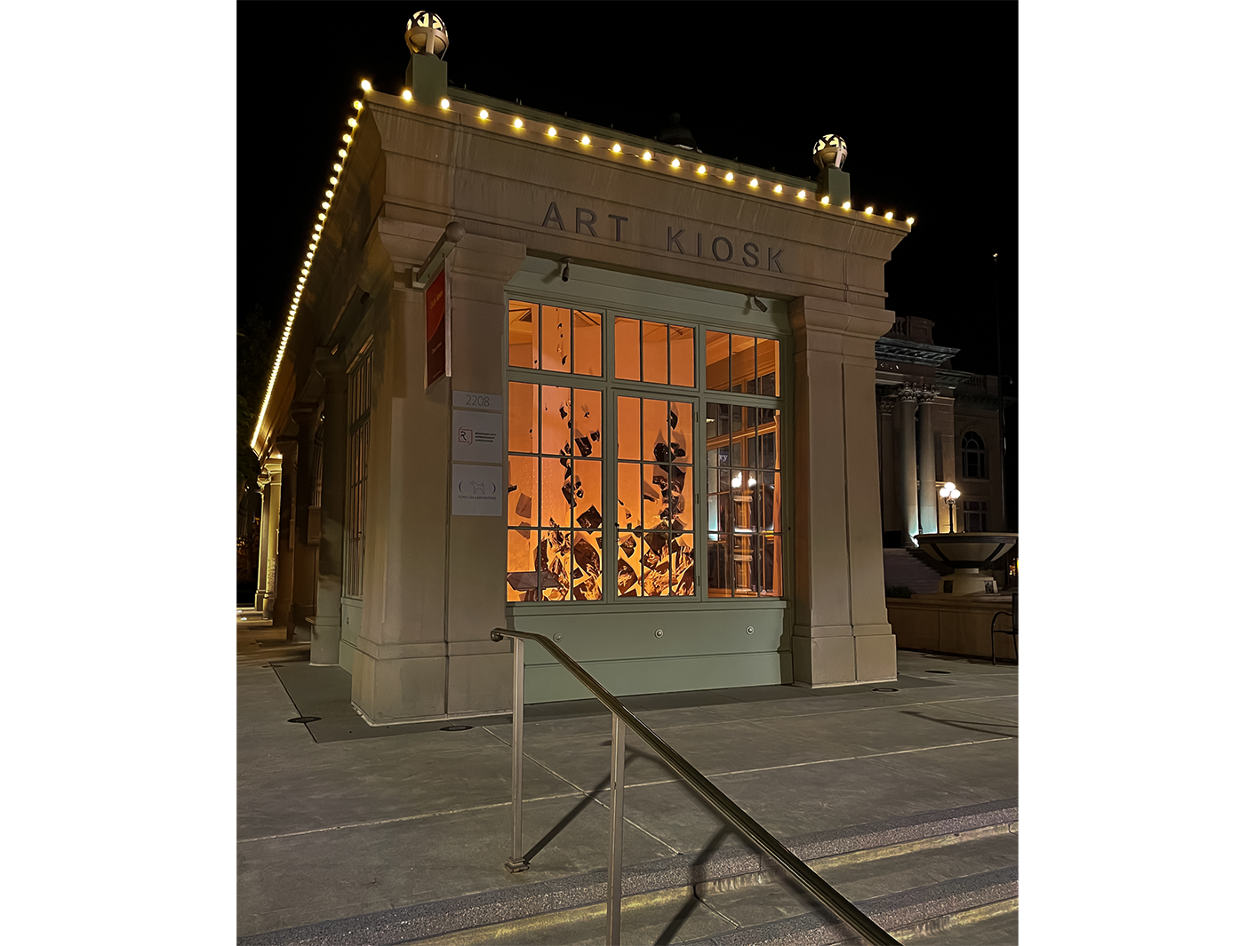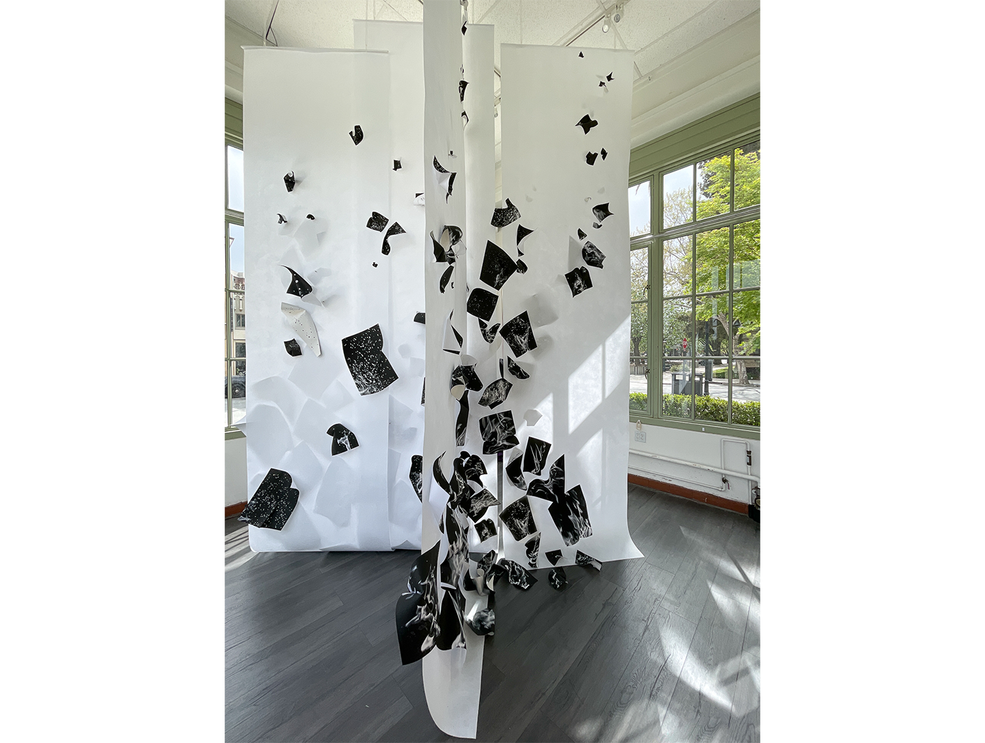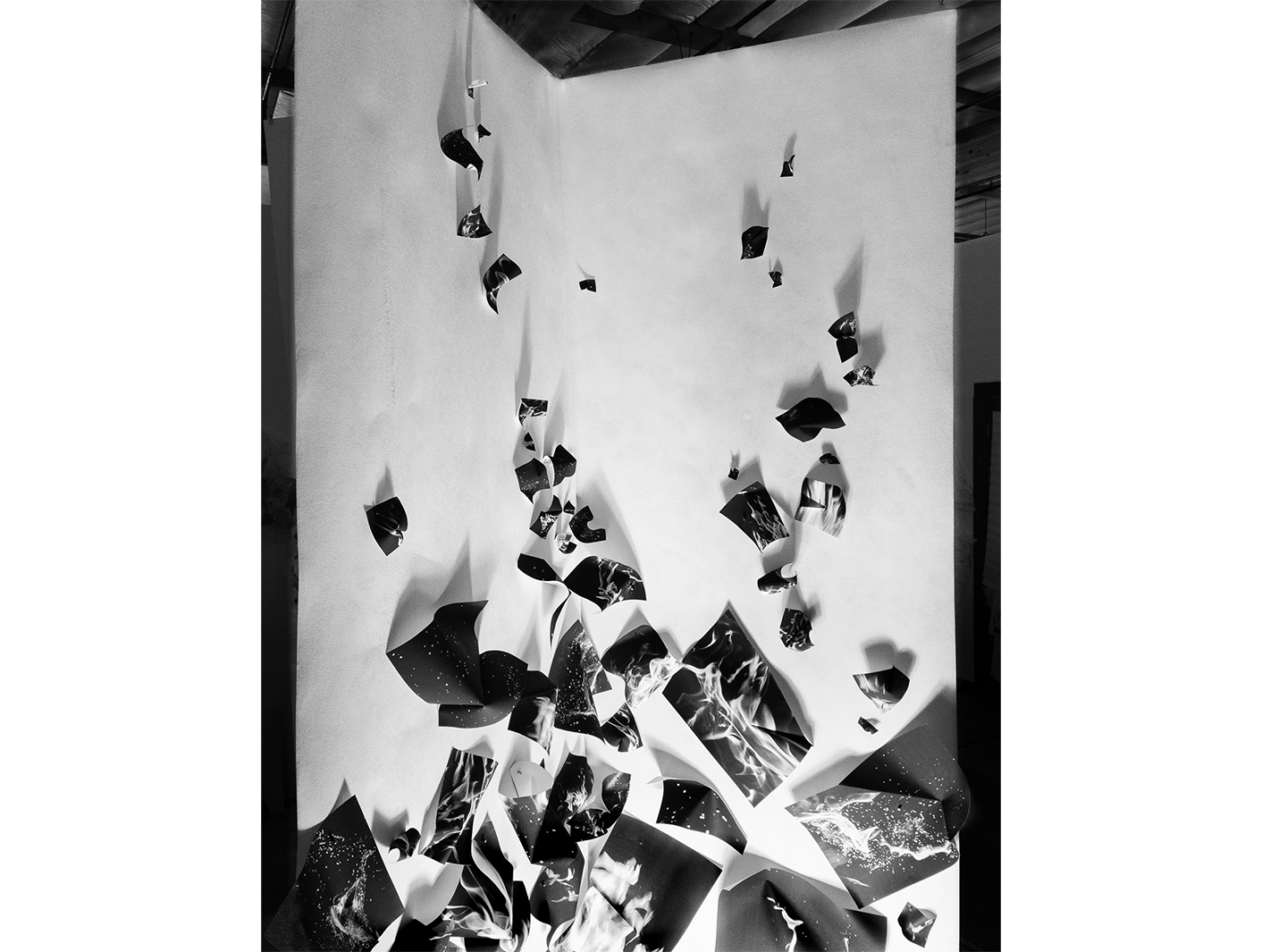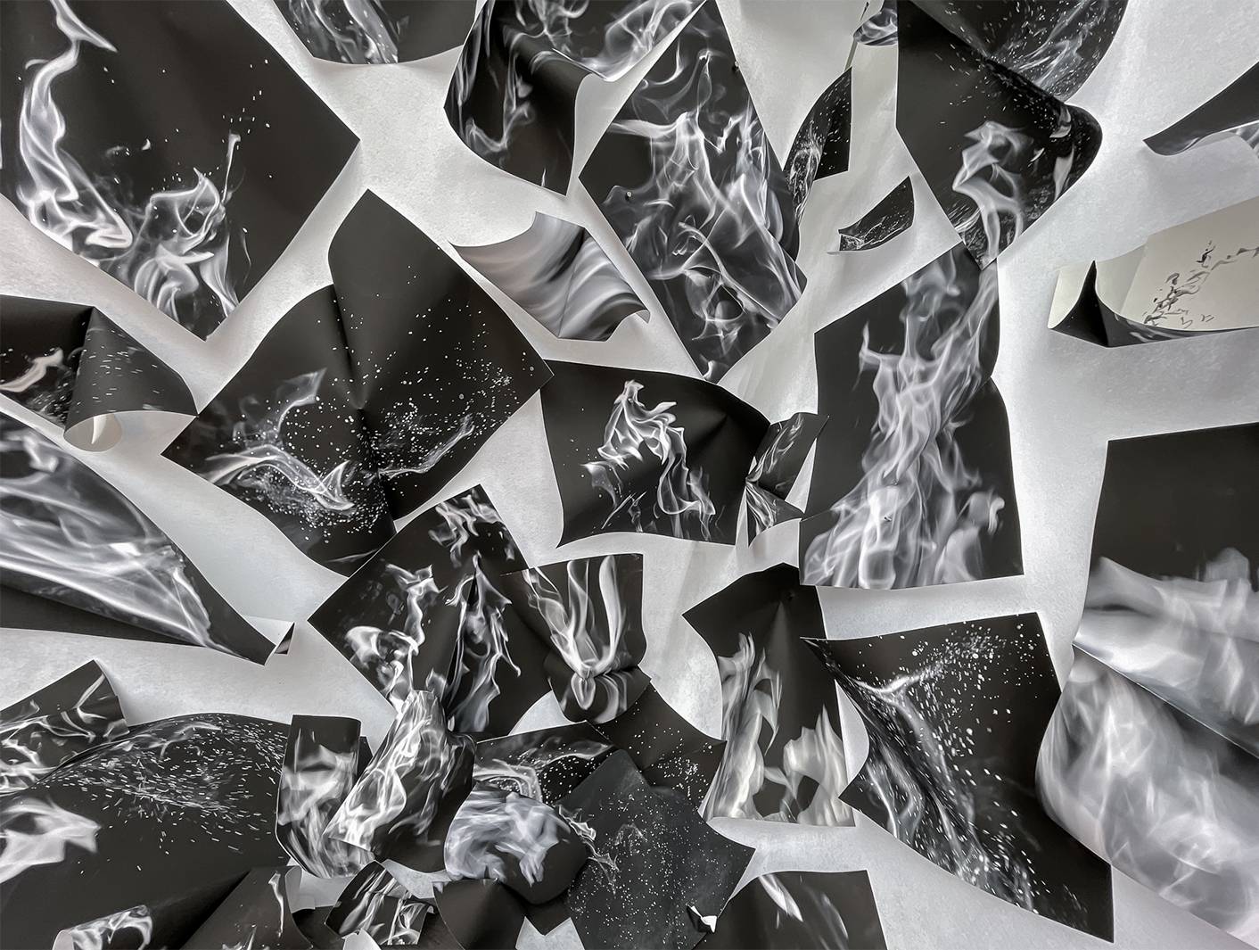Close to Home speaks to these contradictory roles of fire in our lives. It is developed around Stokes’ photographs of flames, sculpted into curving, gestural three-dimensional forms, that were made at family campfires and embody her memories of comfort, laughter and kinship. On a central structure, groups of these sculpted photographs are arranged, mosaic-like, into much larger formations to evoke the ascending flames of forest wildfires. The photographs are also marked with charred wood from the 2020 CZU complex fire that burned for months not far from Redwood City.