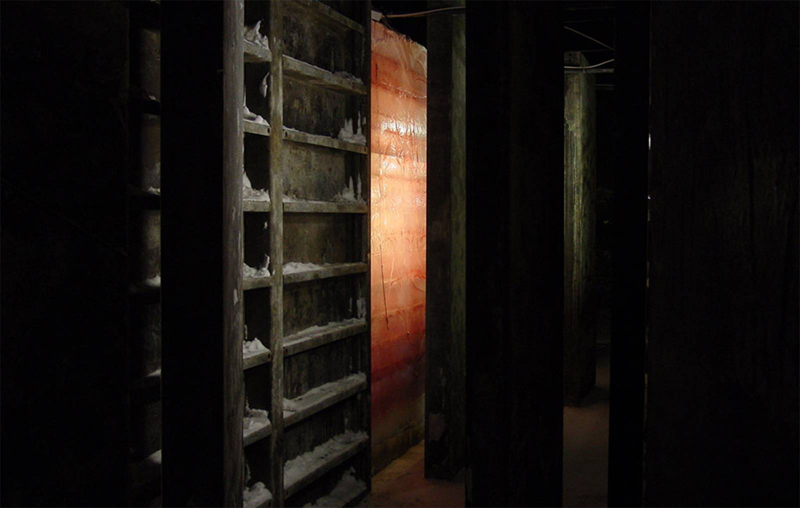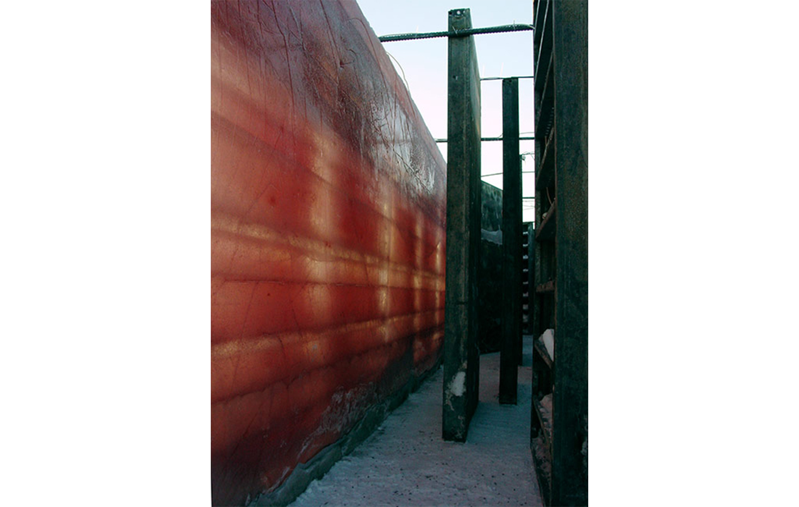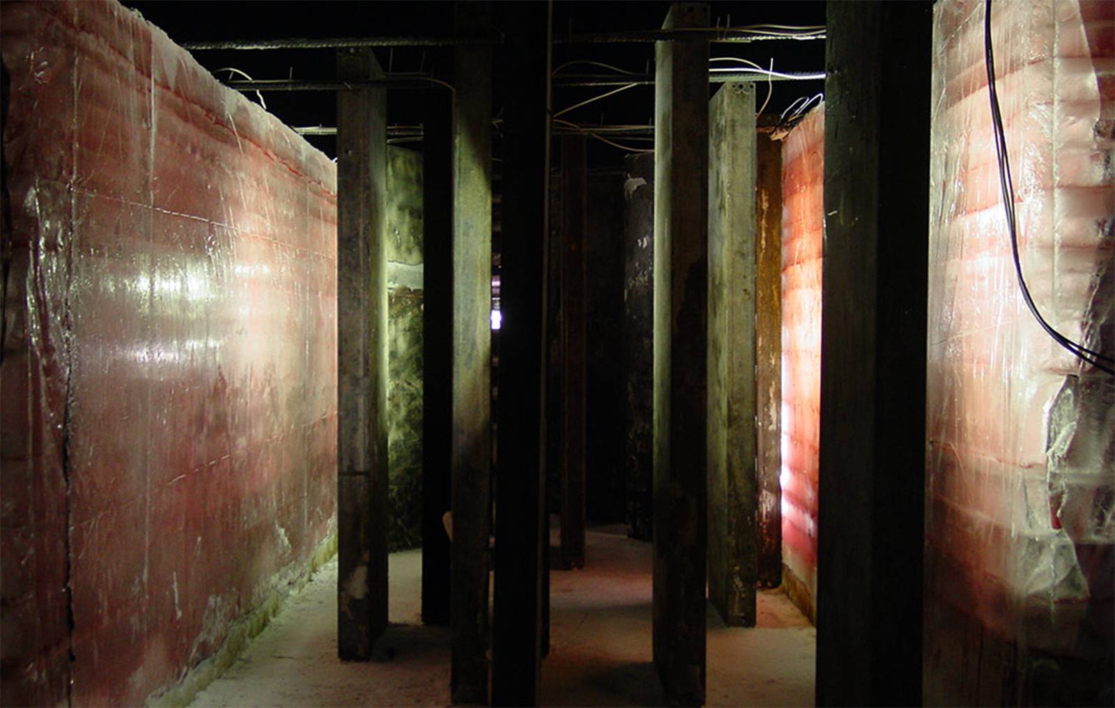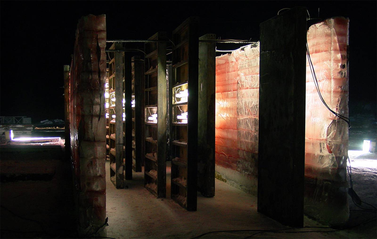 Ingredients: Water, purple dye, 120-x-270cm concrete forms, rebars (concrete reinforcing bars), fluorescent tubes.