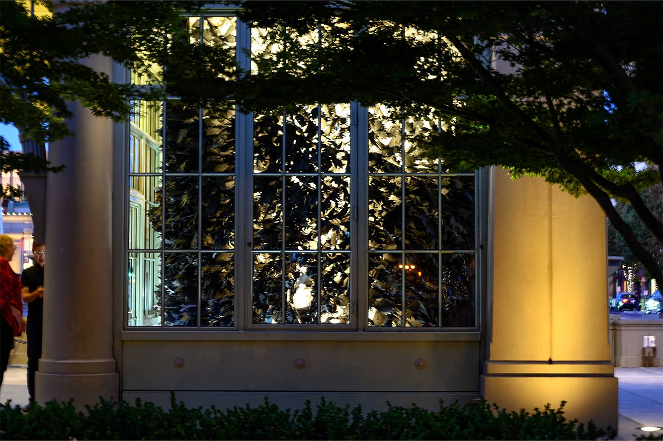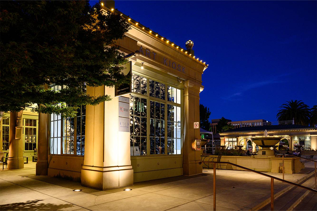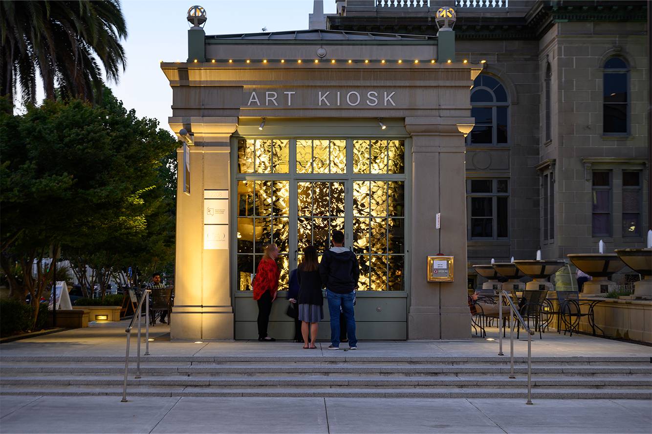 In the Cry Joy Park series, contrasting black and white paper gardens invite the audience into an imagined utopian and dystopian landscape to explore various issues of social inequality, beneath the umbrella of environmental justice. Into the Looking Glass at Redwood City Art Kiosk, highlights the issue of access and division created by the tech boom.