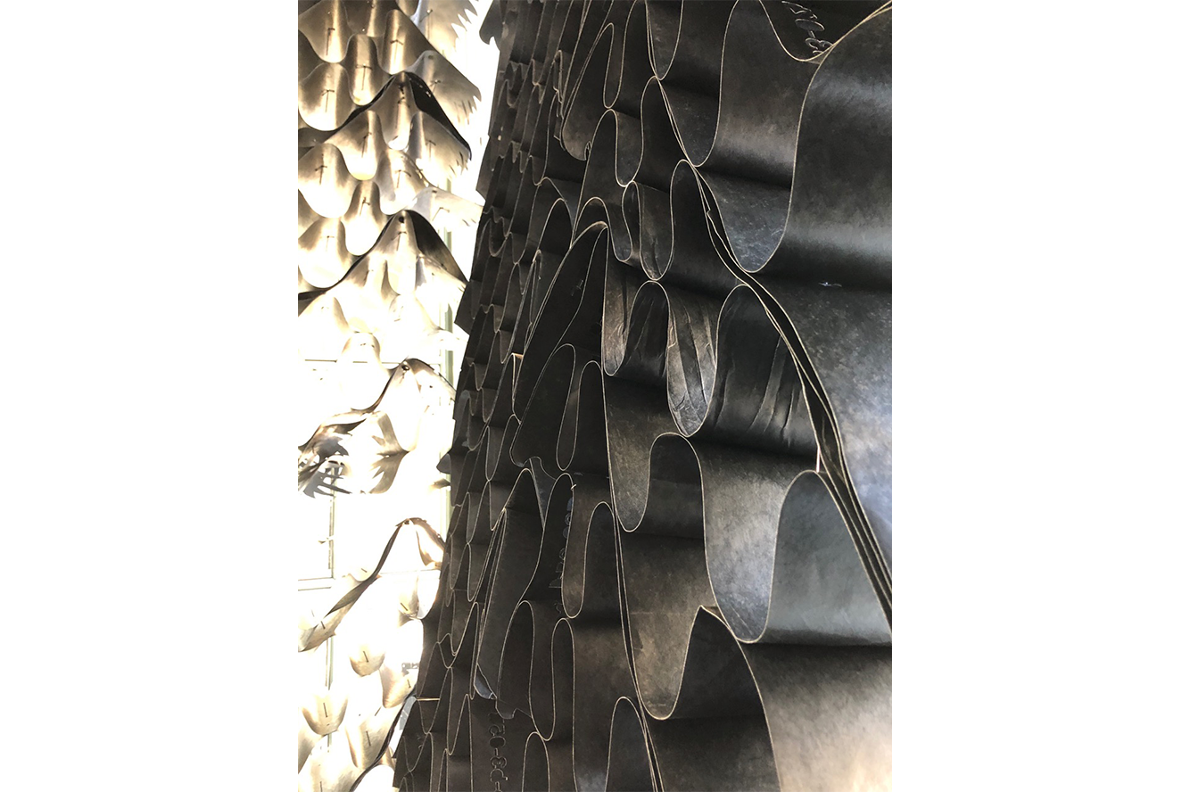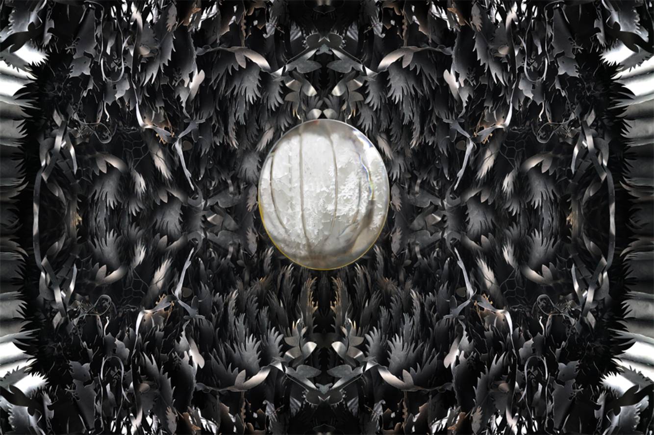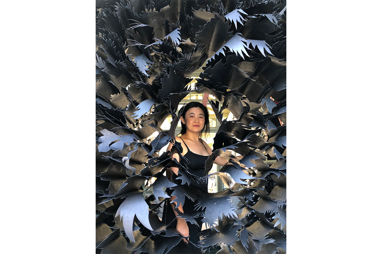 Cry Joy Park: Into the Looking Glass, from Jennifer Wen Ma's current body of work, looks at notions of utopia and dystopia from multiple perspectives and examines the value systems that humans create when building civilizations. These systems are often composed of opposing forces in need of reconciliation and balance. This site-specific installation creates multiple layers of interior and exterior spaces through vertically suspended black and white paper gardens. The exterior garden wall is black and austere, while the white interior garden is light and airy, seemingly soft and inviting. However, the interior is not physically accessible. The visitor can only look through small openings in the black garden walls. Furthermore, these limited access points are fixed with wide angle lenses, therefore the view is distorted.