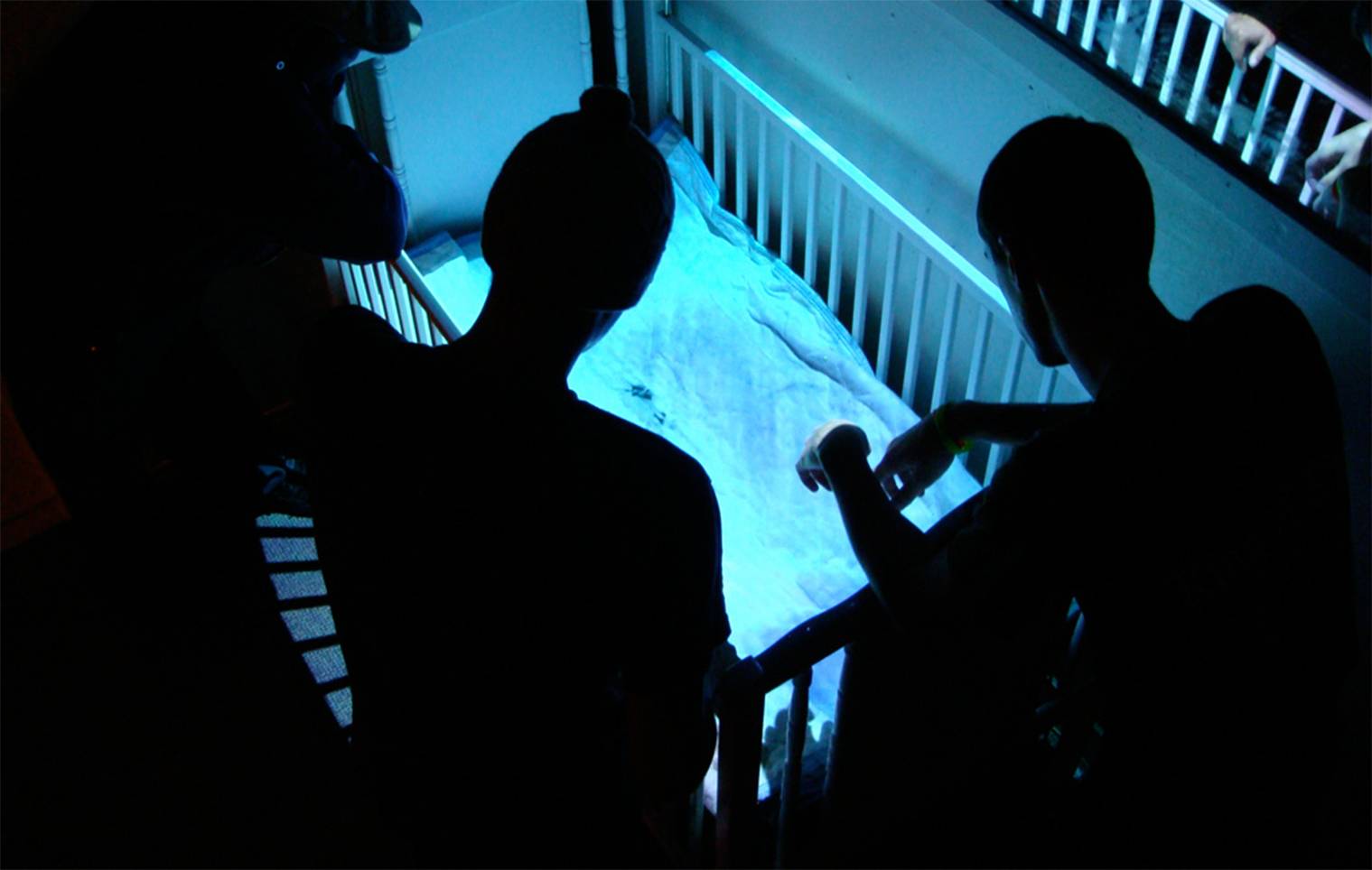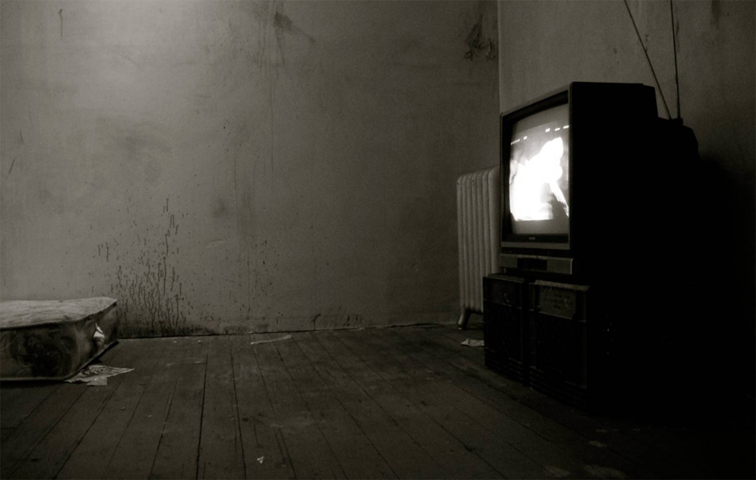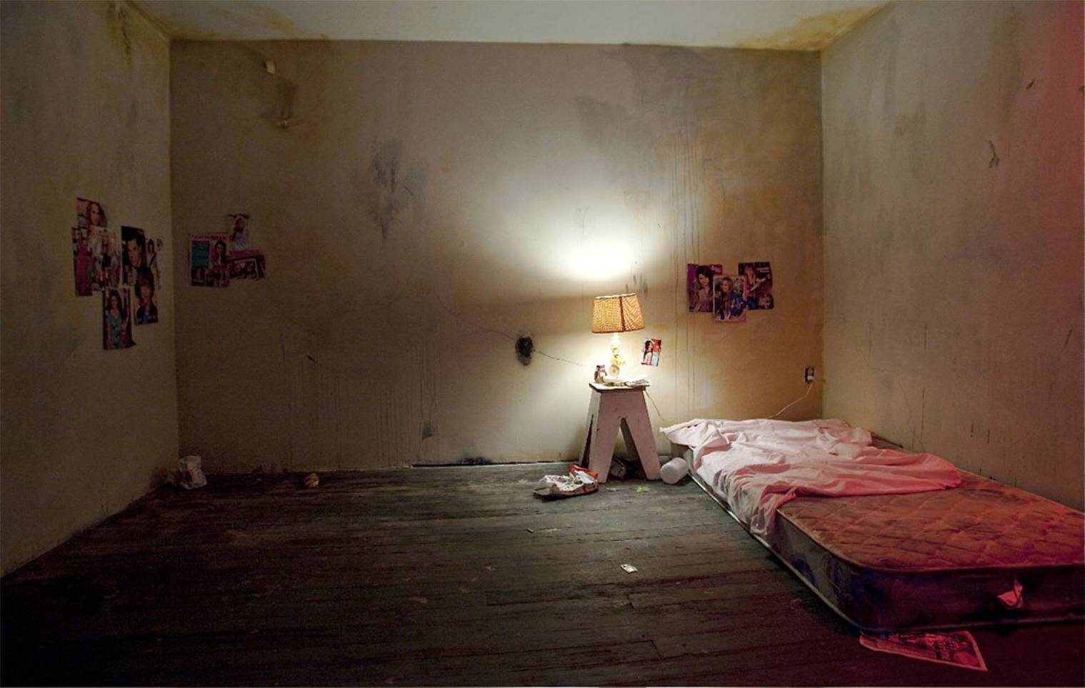 As a metaphor for stolen childhood and loss of innocence, guest were initially confronted by an infant’s crib that included a video projection of an innocent girl playing in the park on swing, monkey bars and merry-go around. In the adjacent room, magazine cutouts of American pop culture brood over a bare, putrid mattress. A stash of penicillin, morning after pills and condom wrappers are among the remnants that lingered along the nightstand and across the hard, cold floor. A continuous loop Alice in Wonderland falling down the rabbit hole played in black and white on an old television to symbolize non-escapism. The realistic and abstract sound design created a haunted vibe that served to further affect the viewer’s emotional state.