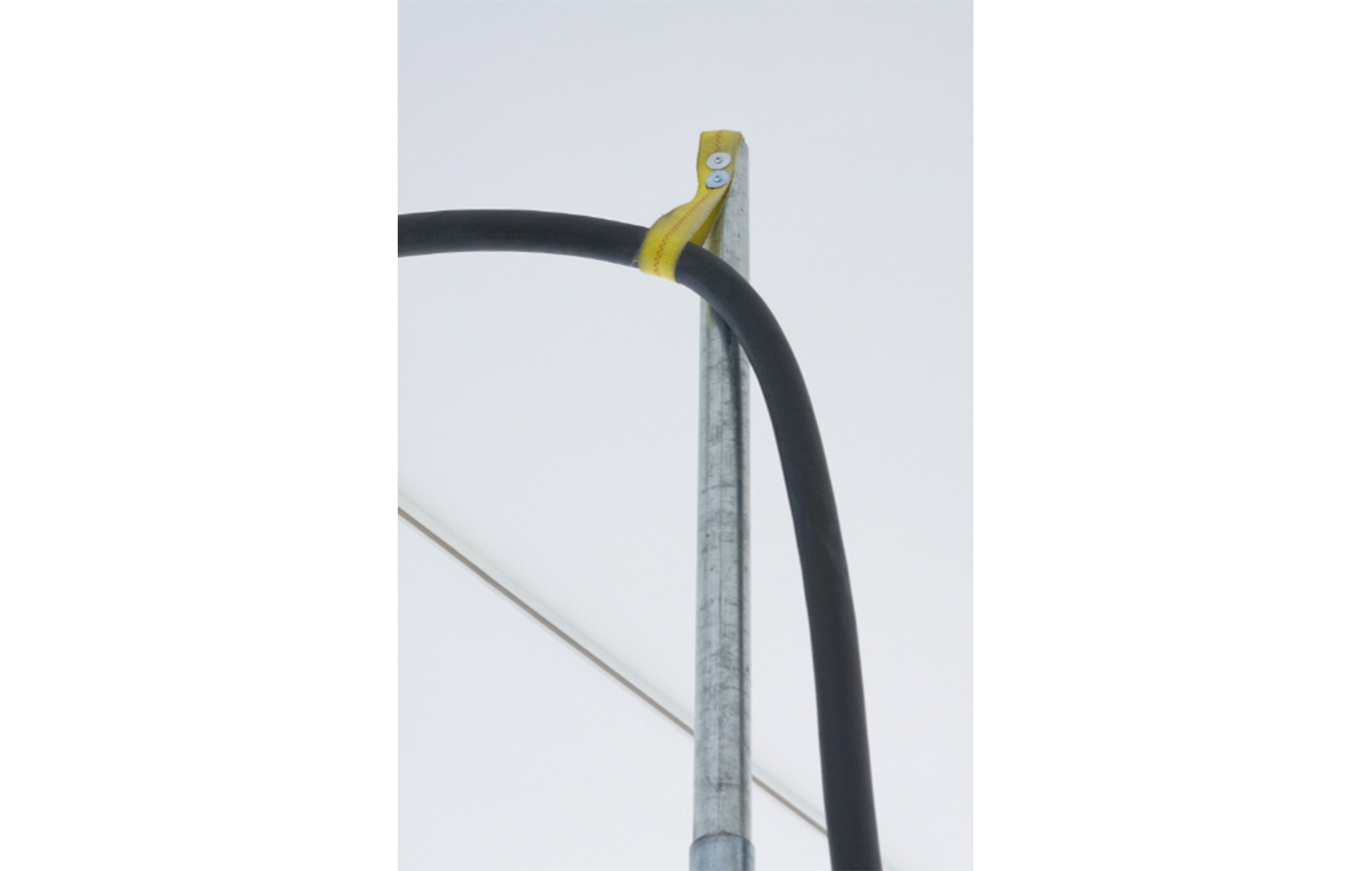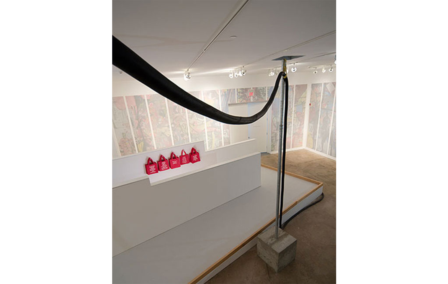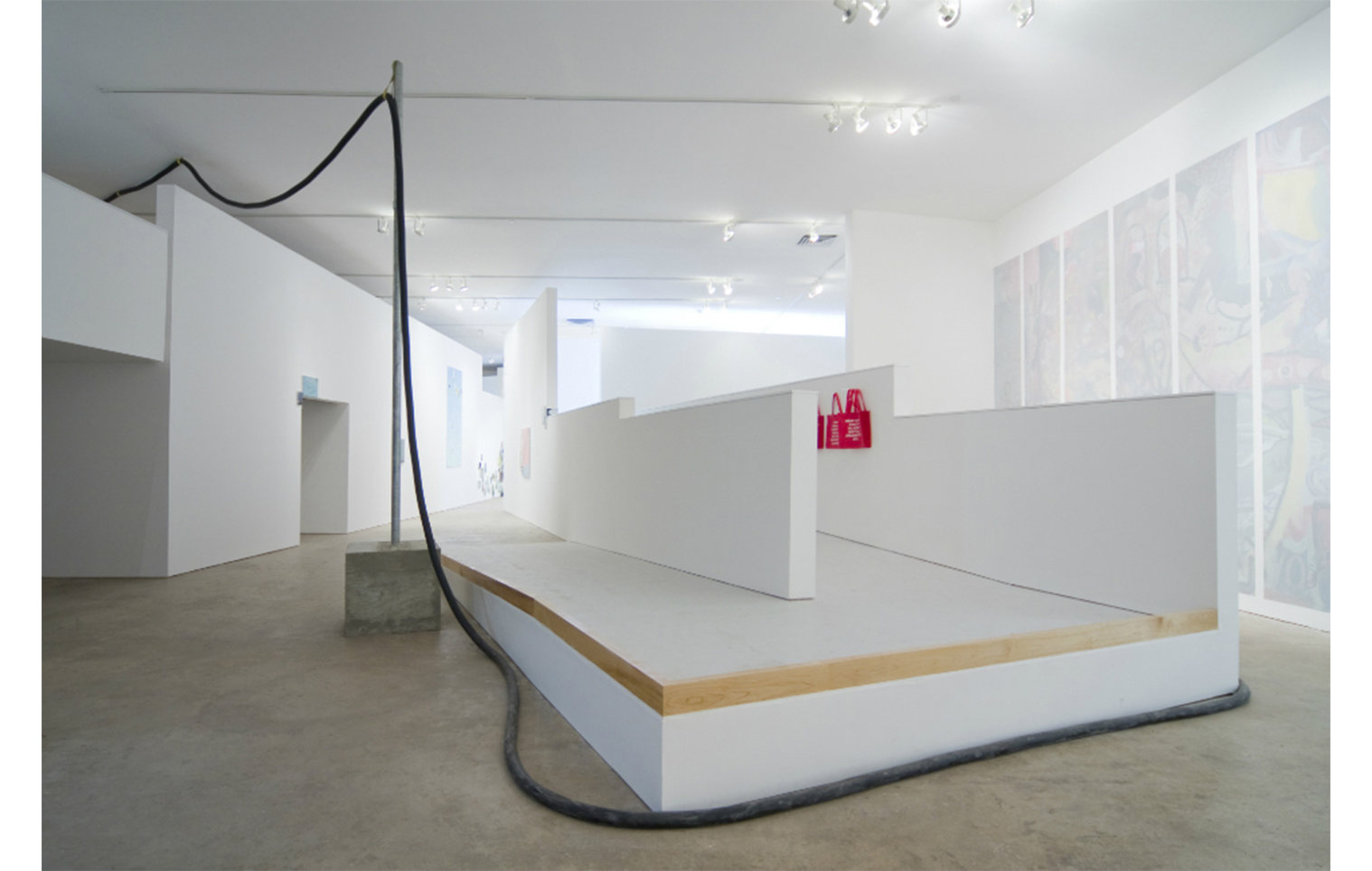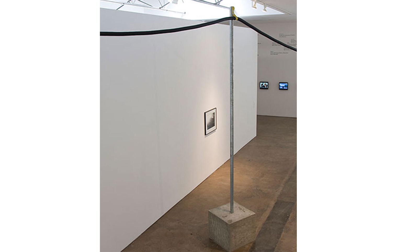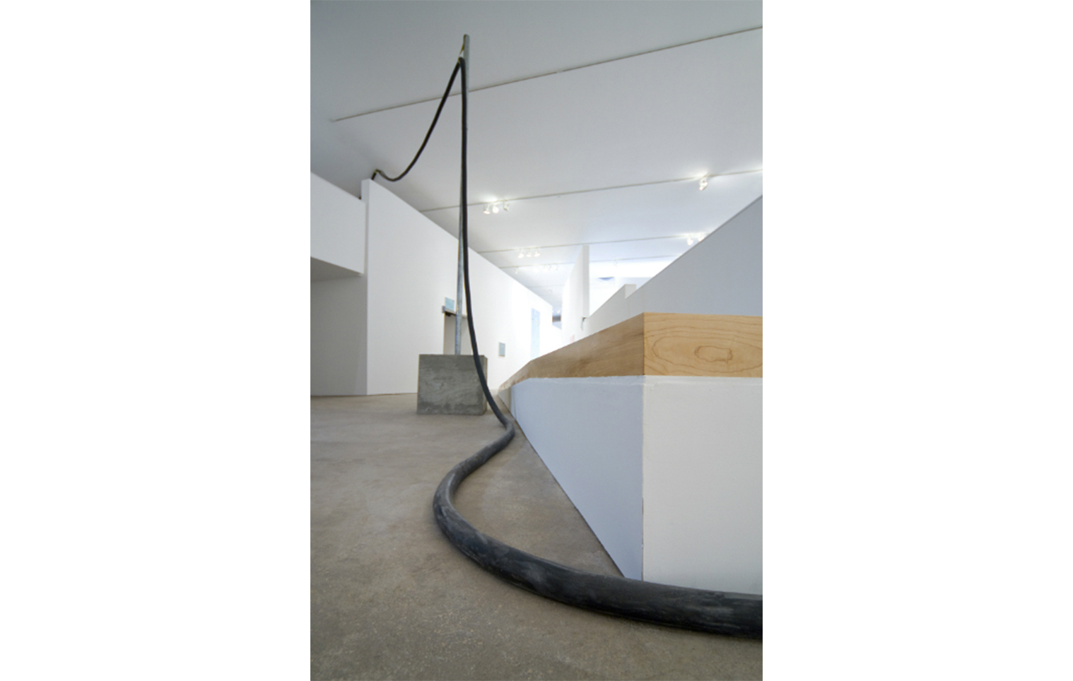 On the one hand the work can be seen as a concrete elevation of the technical possibilities of the exhibition space, making any kind of theatrical apparatus feasible. On the other hand, seen as a sculptural work, which is meandering throughout the exhibition space and revealing its purpose at the end, it plays with the same mechanisms that are employed by entertainment industries.