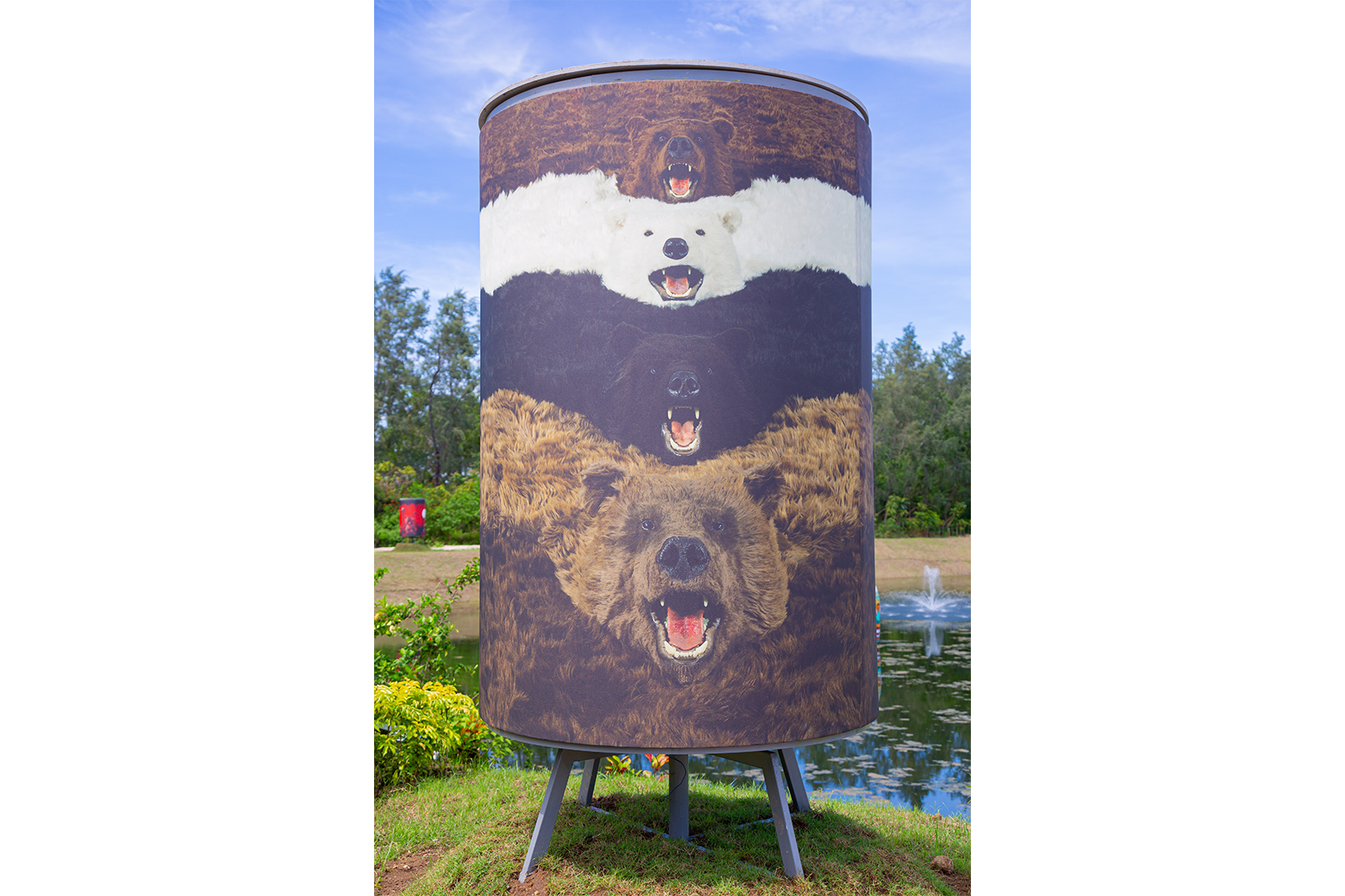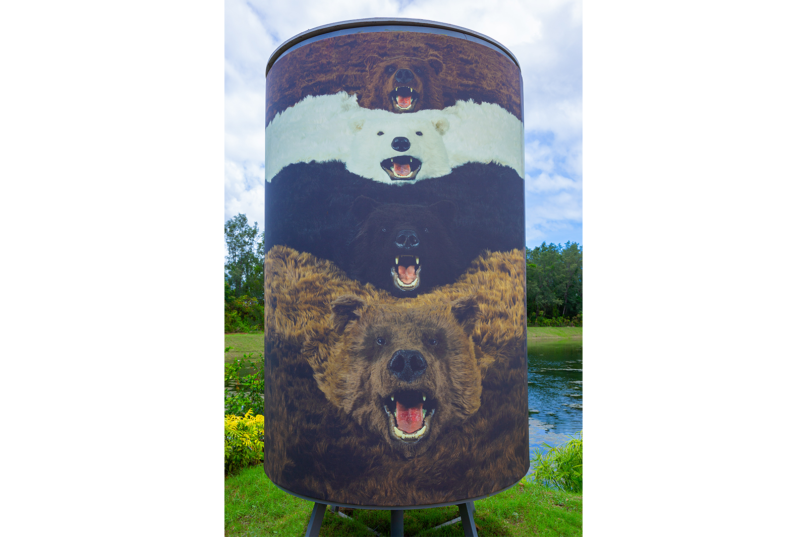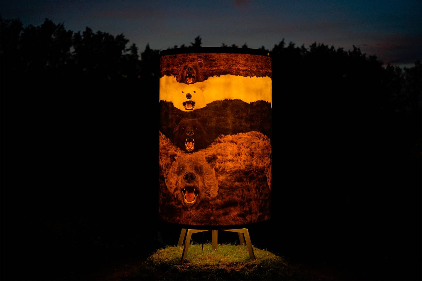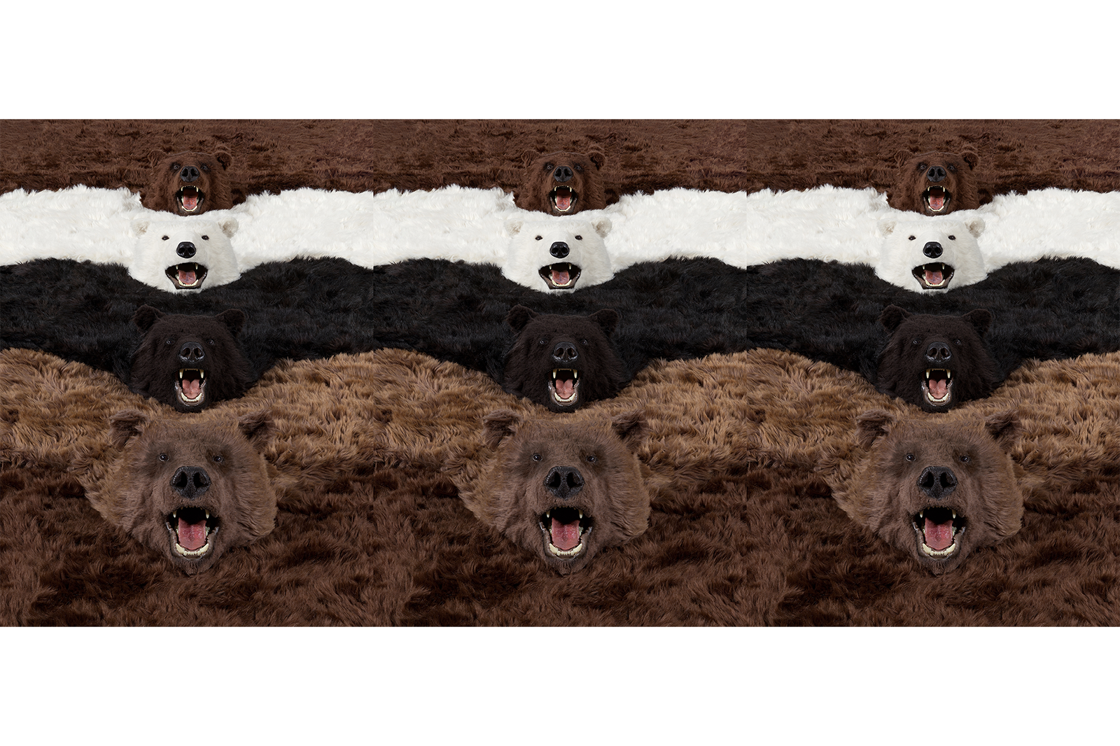 Paola Pivi’s photographic artwork “I’m a bear so what” (2012) is derived from the large scale installation “What goes round, art comes round” (2010), consisting of 24 bears rugs, which are custom made and completely fake, but which appear extremely realistic. The fake bear rugs are playfully and theatrically displayed overlapping in a line, forming a continuous loop, on floor, walls and ceiling of the exhibition room. The photograph was shot by Attilio Maranzano.