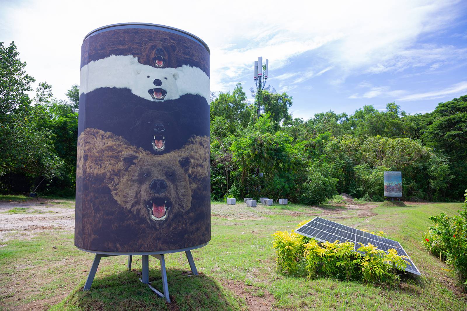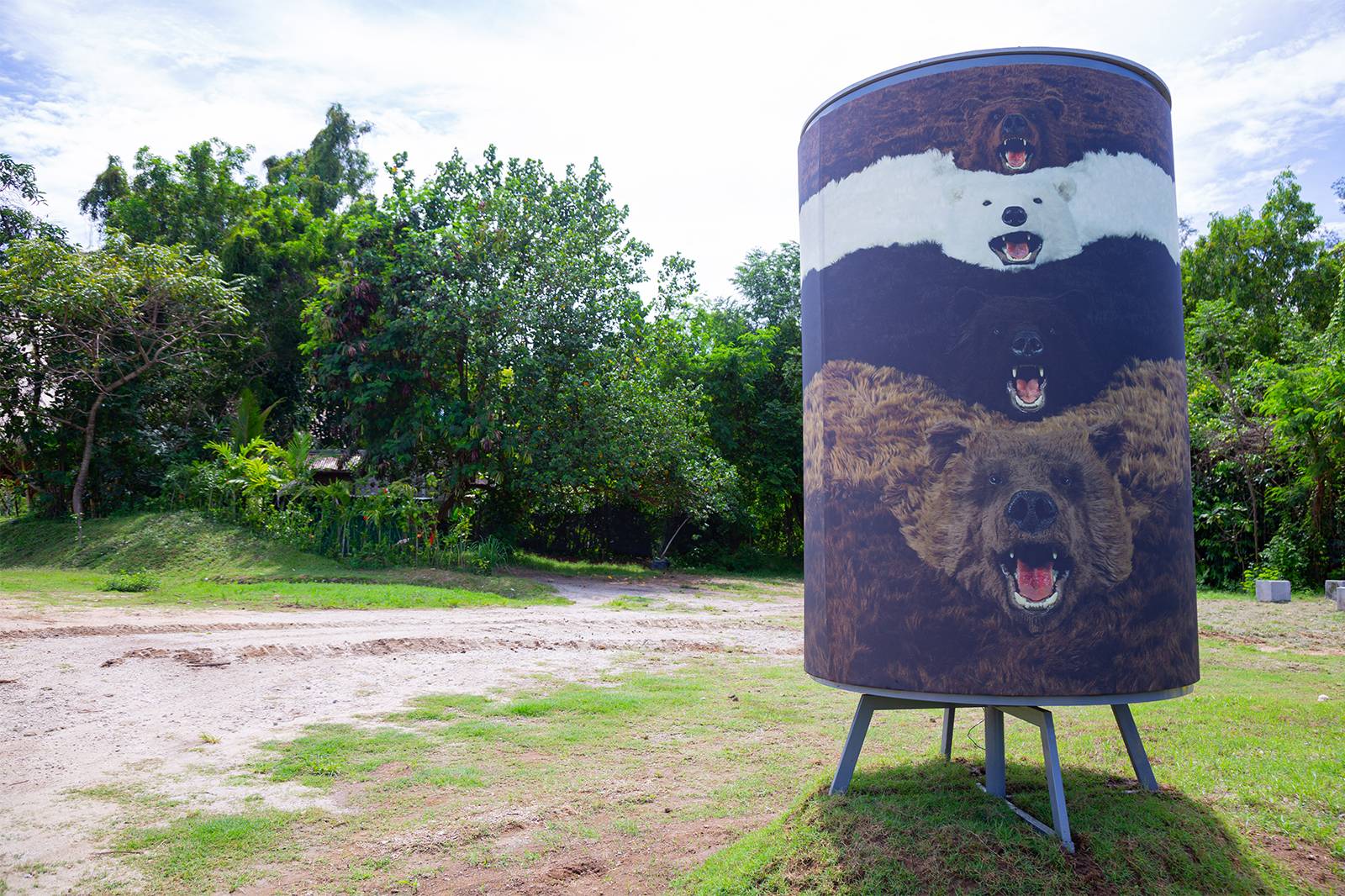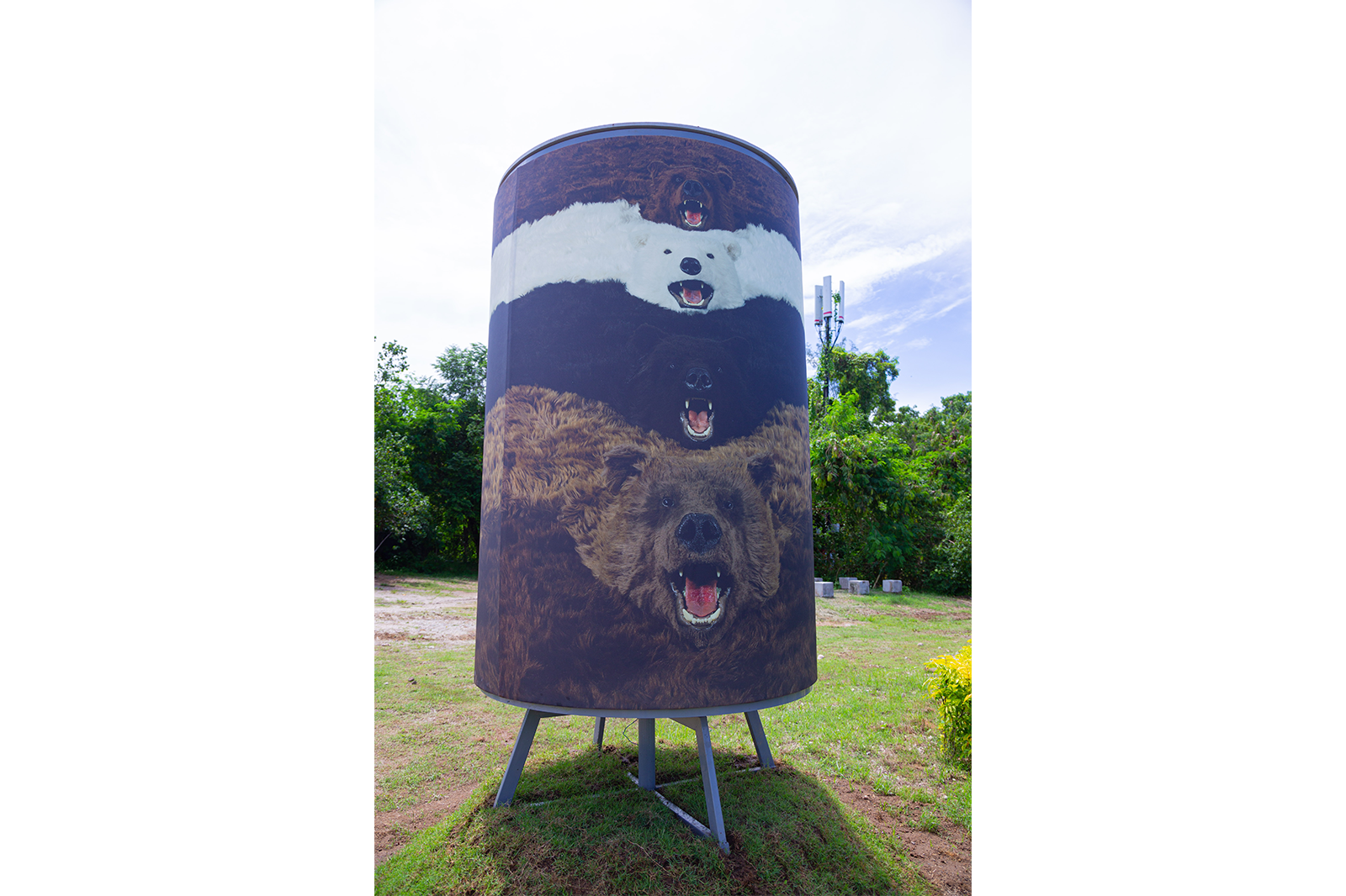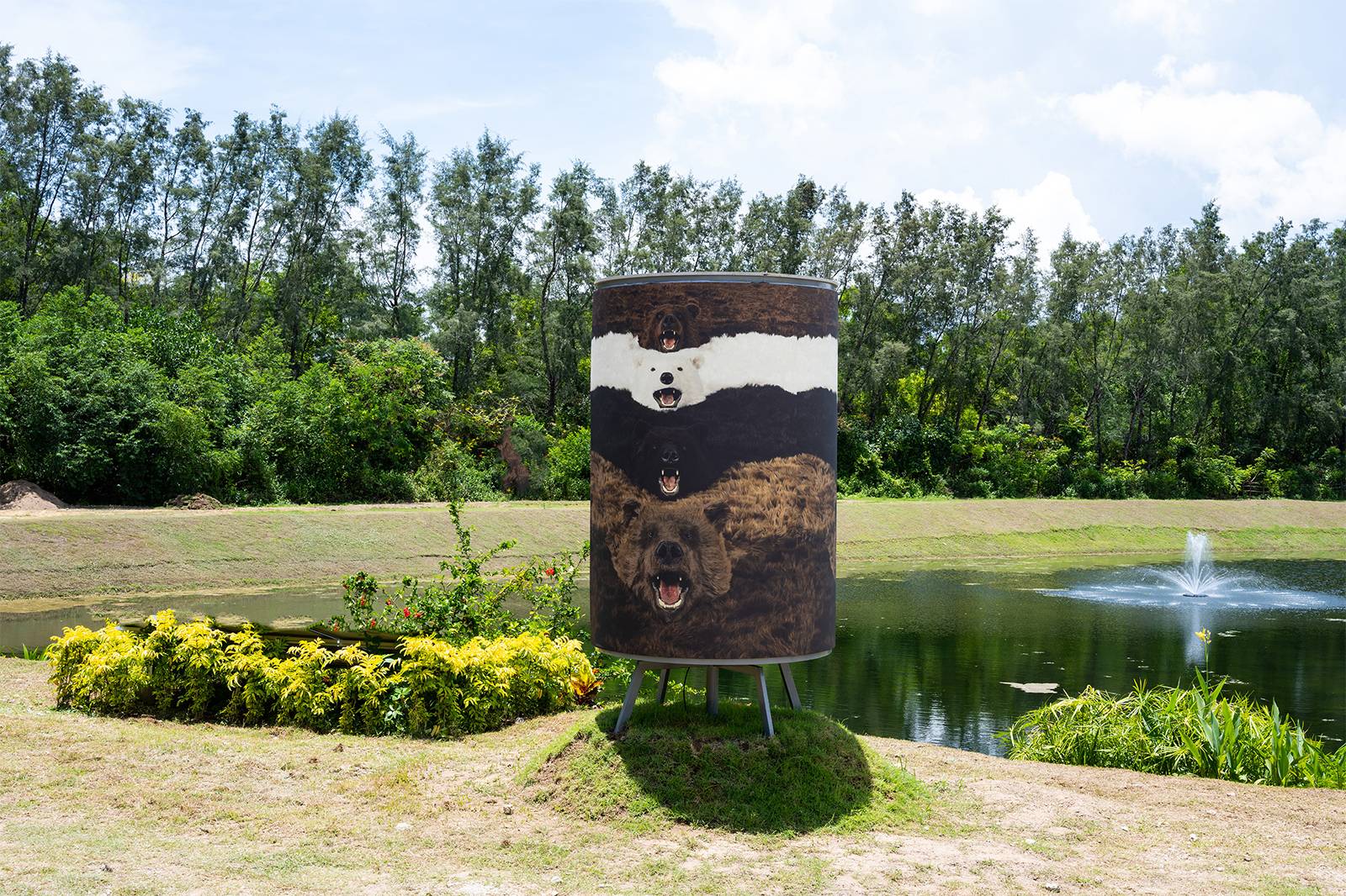 Paola Pivi’s photographic artwork “I’m a bear so what” (2012) is derived from the large scale installation “What goes round, art comes round” (2010), consisting of 24 bears rugs, which are custom made and completely fake, but which appear extremely realistic. The fake bear rugs are playfully and theatrically displayed overlapping in a line, forming a continuous loop, on floor, walls and ceiling of the exhibition room. The photograph was shot by Attilio Maranzano.
