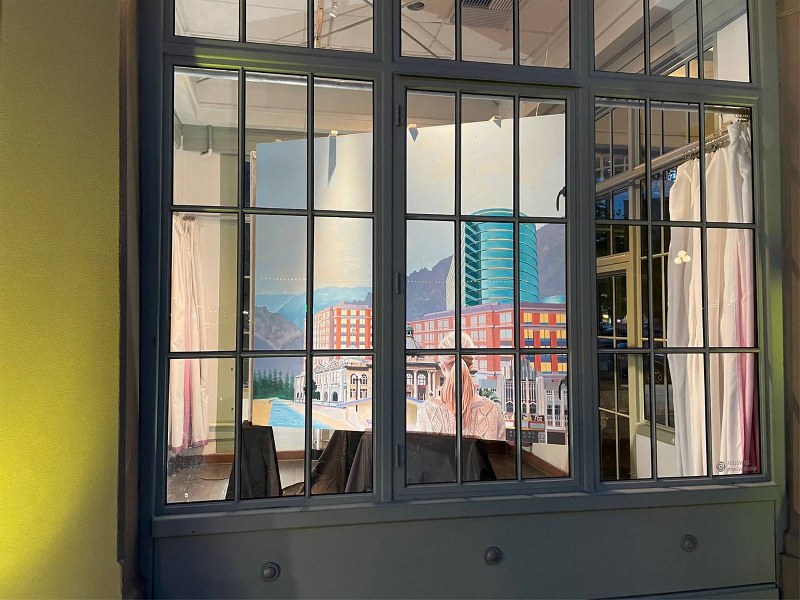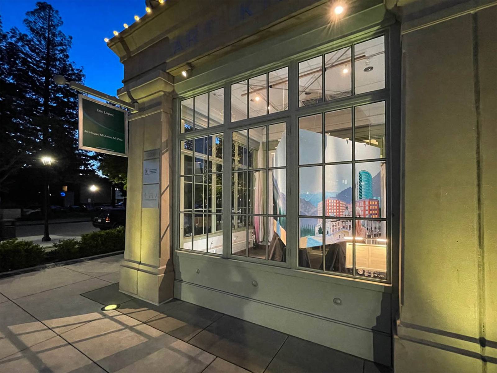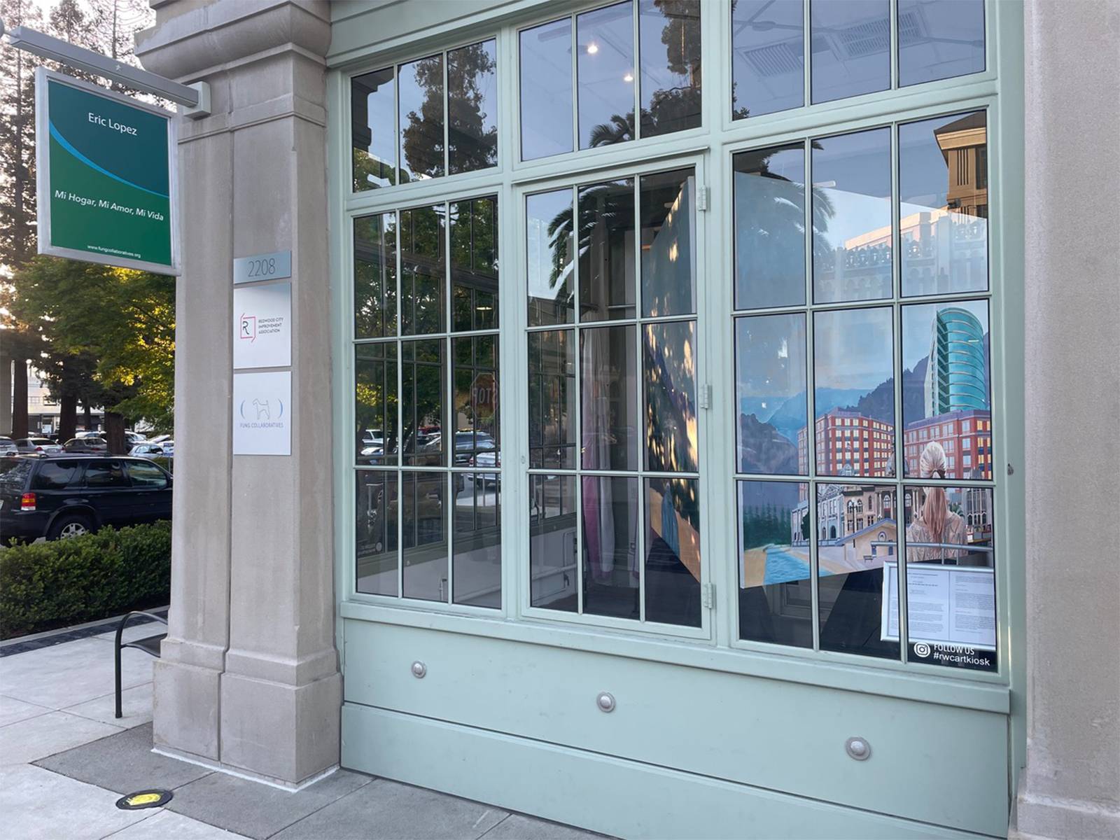 “The artwork titled Mi Hogar, Mi Amor, Mi Vida (My Home, My Love, My Life) is an oil painting created on two large canvases, each measuring 7′ x 8′. The painting depicts mountains in the background with Redwood City buildings in the foreground to the right. With a male and female viewers, one on each side, one is looking towards the beautiful nature and the other to the elegant architecture of Redwood City. Lively colors engulf the painting bringing together nature and this wonderful City together into one.