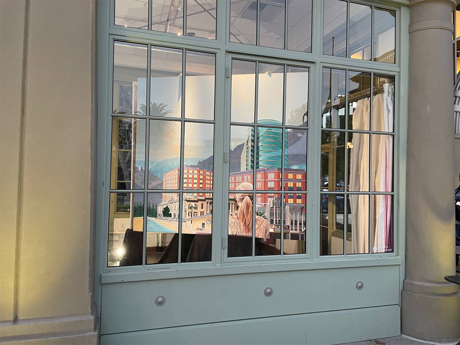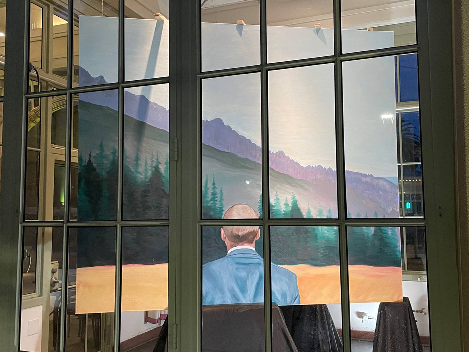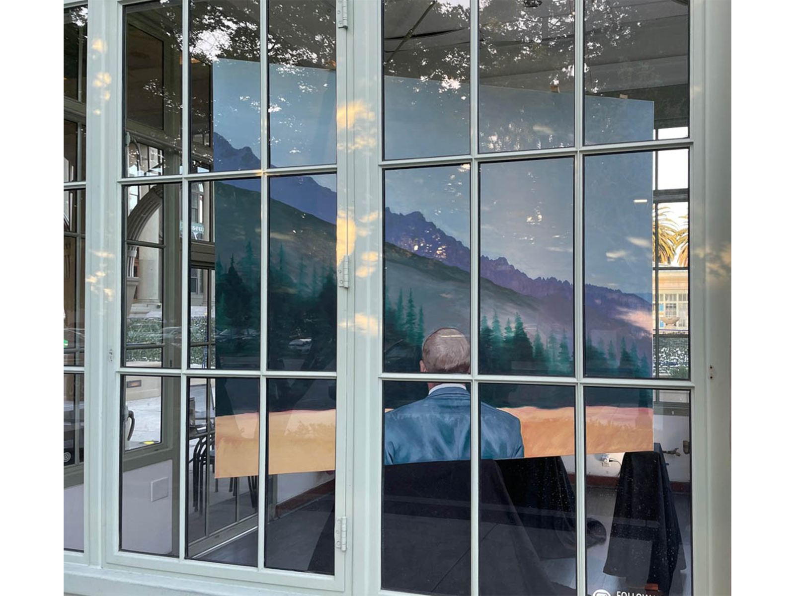 “The artwork titled Mi Hogar, Mi Amor, Mi Vida (My Home, My Love, My Life) is an oil painting created on two large canvases, each measuring 7′ x 8′. The painting depicts mountains in the background with Redwood City buildings in the foreground to the right. With a male and female viewers, one on each side, one is looking towards the beautiful nature and the other to the elegant architecture of Redwood City. Lively colors engulf the painting bringing together nature and this wonderful City together into one.