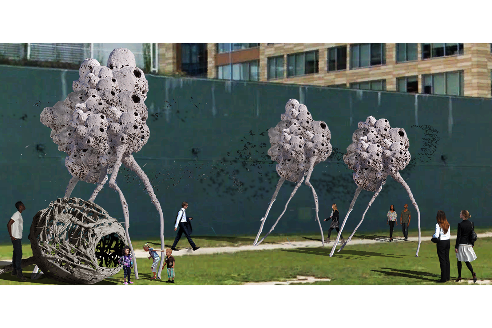 Migration is a subtle rumination on how the planet's urban centers grow, and ultimately adjust to accommodate their citizens. Can we live in neighborhoods of economic, social, cultural diversity that aren't determined solely by a market economy? This piece provides a chance for art to enter and enrich the everyday lives of residents walking between home, work, and school. Where we nest physically, emotionally, psychologically, culturally, and spiritually is an important aspect of our identity. Swallows build cities like humans. Watching the murmurations of swallows in the sky, as their streams morph into vast clouds, rising and falling, finally dissipating only to reform with great intensity, it is easy to imagine how urban communities may collectively reshape their destinies. Ultimately, Migration may be moved to a suitable regional park or arboretum to become habitat for nesting birds in the spring. But perhaps Migration will linger in the minds of those in Washington D.C. who dream of a city where there is a place for everyone.