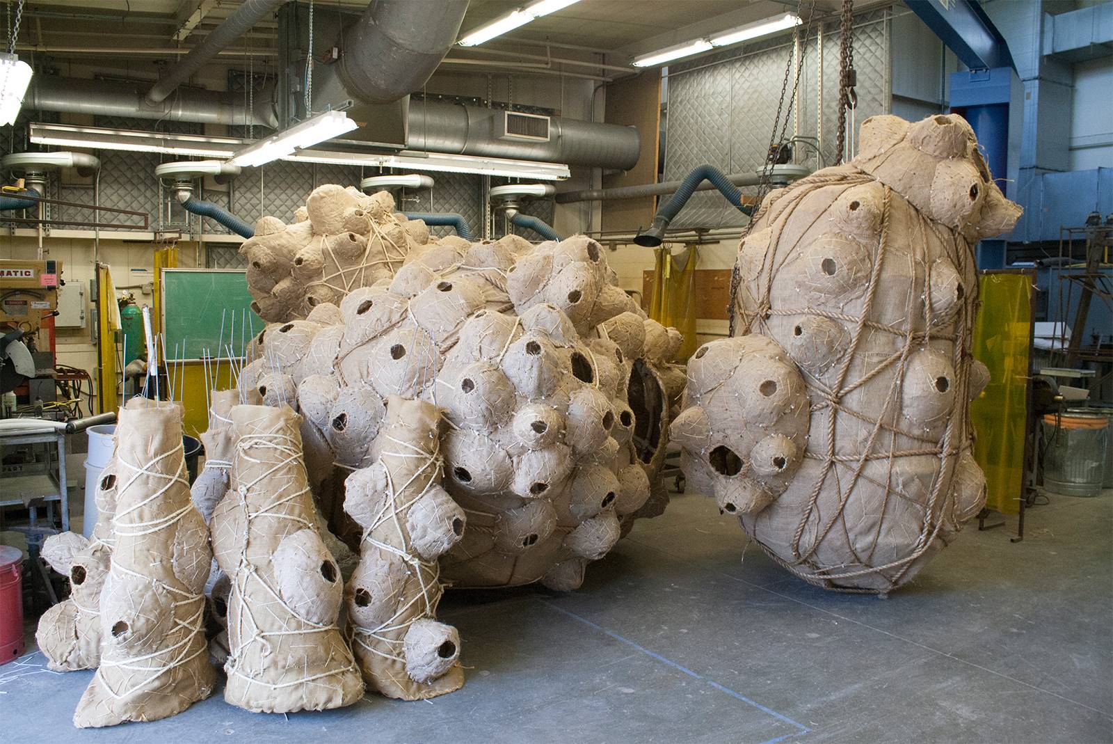 Researching bird habitats I realized different conditions were needed to attract swallows like water, tall grass, vast meadows, and abundant insects. However, some pigeons began roosting on sculptures or gathering near their legs. Maybe it is fitting that long time residents like pigeons, proven resourceful in the most adverse urban conditions, could make a home of Migration. My work is usually created from, and documented amidst forests, fields, and coastlines. Migration drew no strength from such environments, instead depending on the green screen of a stark urban wall to throw form into high relief.