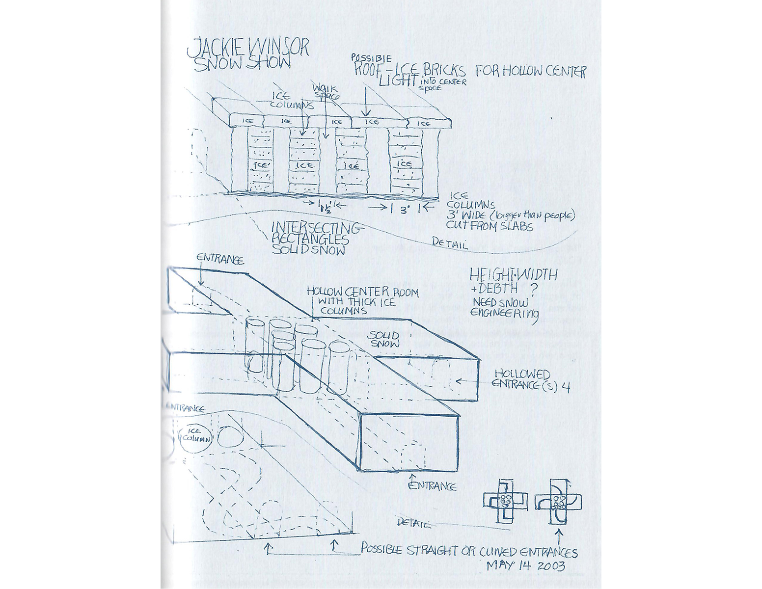 "Minus House" is about carving a sequence of negative spaces in a simple snow/ice volume. The spatial sequence is part of the experience of approaching the river from the land and one makes various contacts with the surroundings, or nature, on the way through the apertures in the structure.