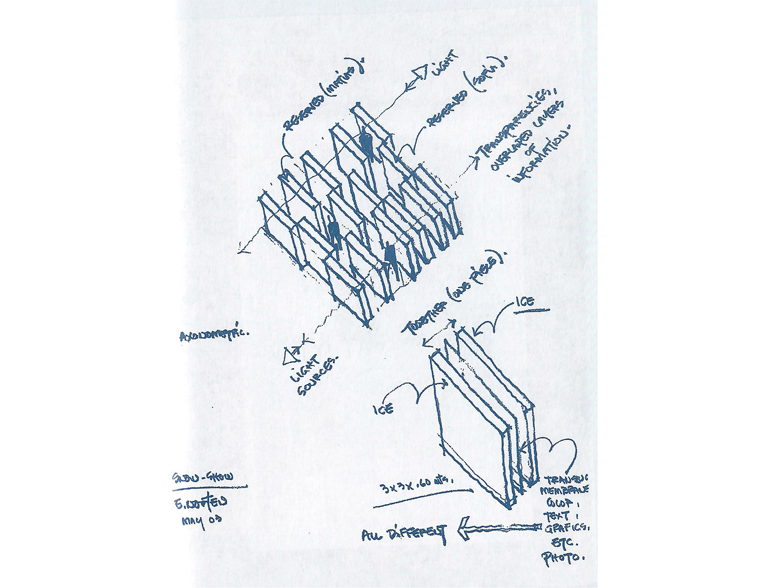 The walls will create some interstitial spaces that can be walked and experienced in many different manners by the public (no path defined). Each wall will have inside, in the middle a translucent membrane with a work of art (graphics, text, photo, drawing, painting, etc. ANYTHING, as long as it is basically two-dimensional), creating an overlap of various layers of art information that can be read in various different ways: individual-collective, inside-outside, private public, etcetera.