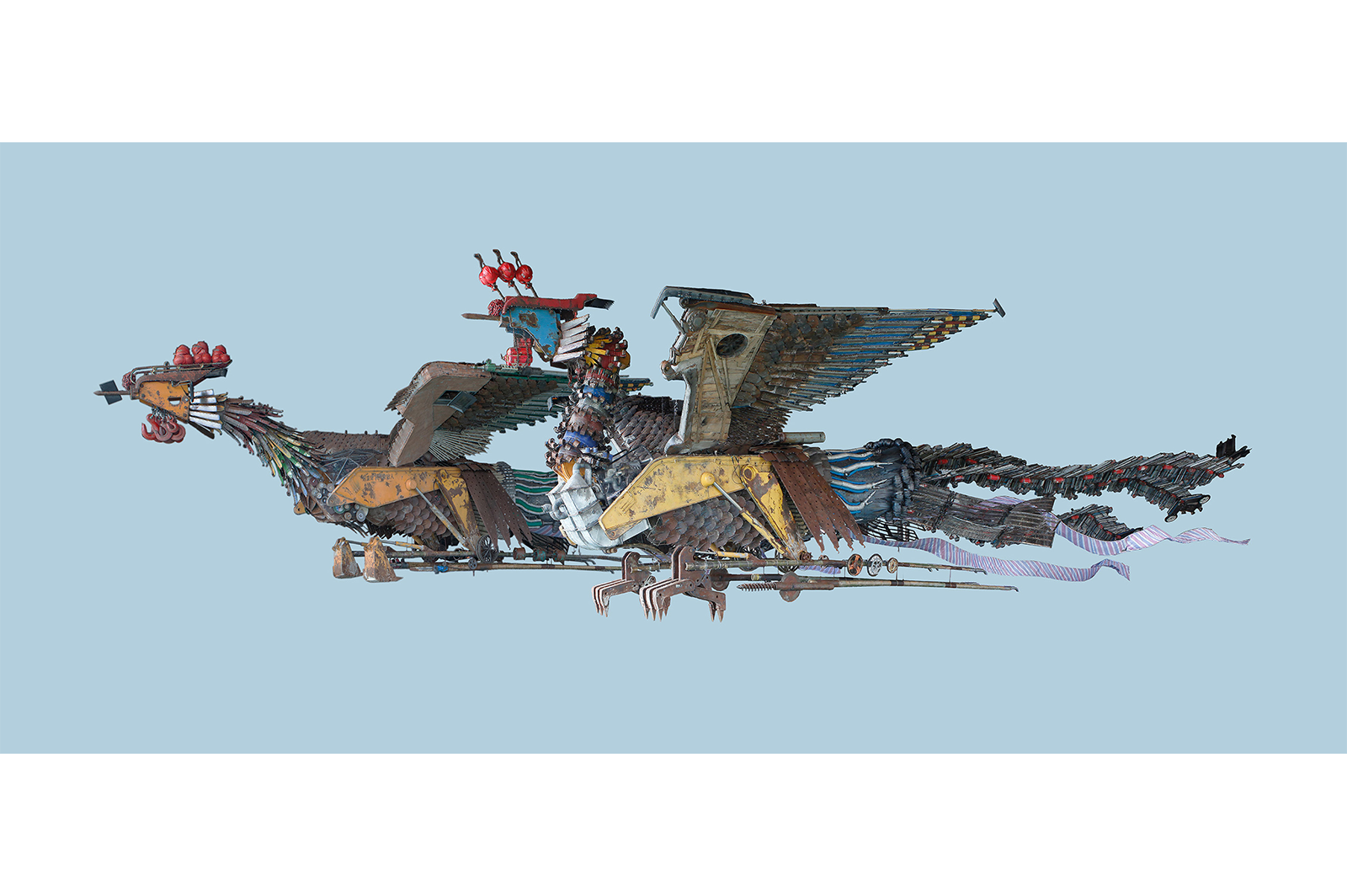 The creation of Phoenix rose from the midst of 2008 in Beijing. Xu Bing just returned from New York and was profoundly struck by the disparity between the ornate and modernized architecture and the crude and shabby living condition of their builders. Xu then picked up waste, construction tools and materials from the ruins of the construction site and created a massive pair of Phoenixes. Due to the entangled complications with the given space-time in China, Phoenix was not able to soar along the skyscraper as originally planned, but instead swam and roamed all over the world. This work encapsulates the artist’s deep contemplation on rapid urbanization, the new-age Proletariats, and capital accumulation.