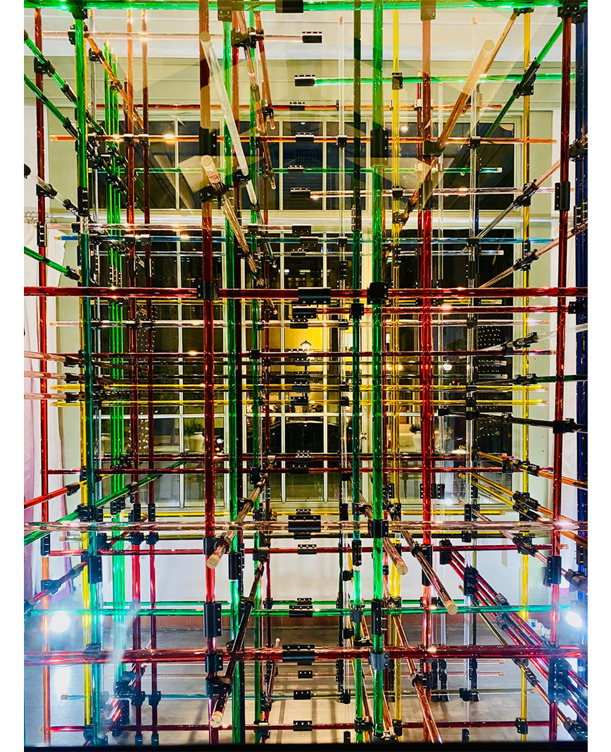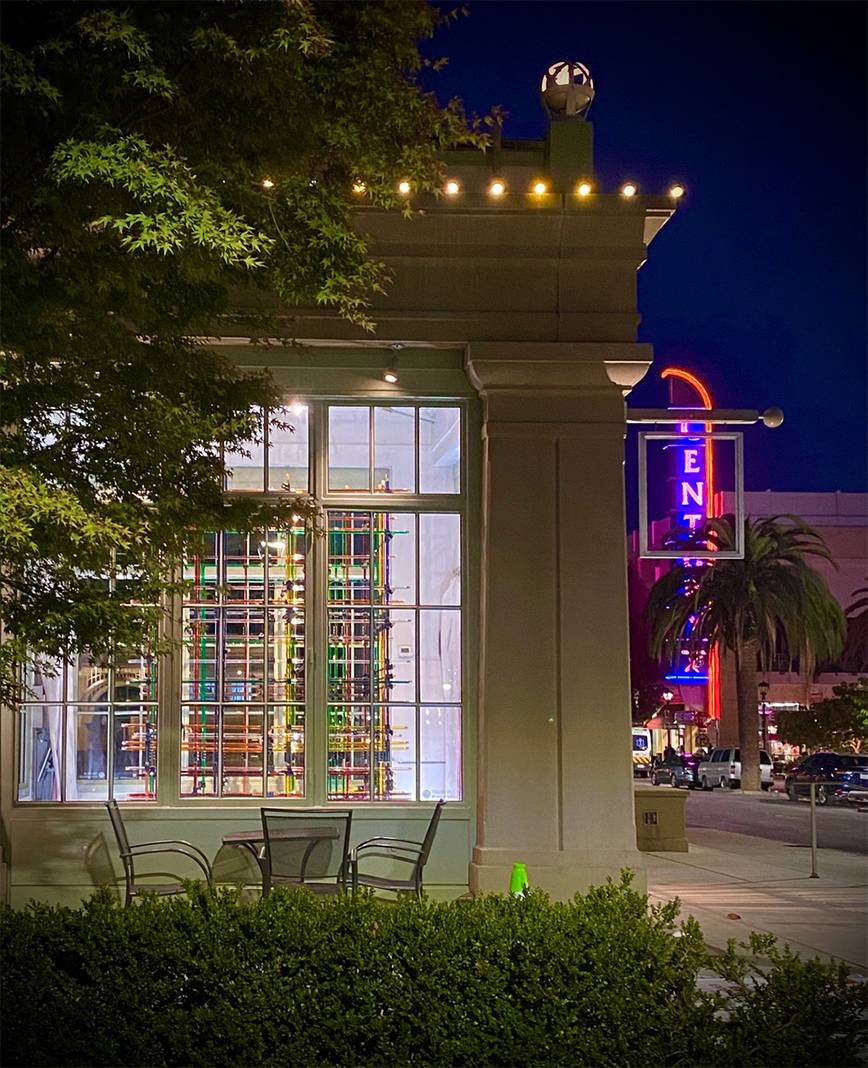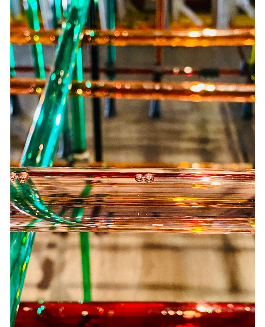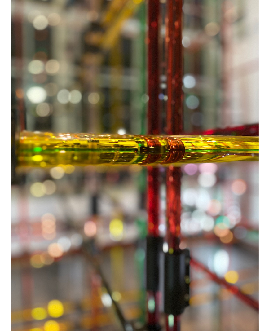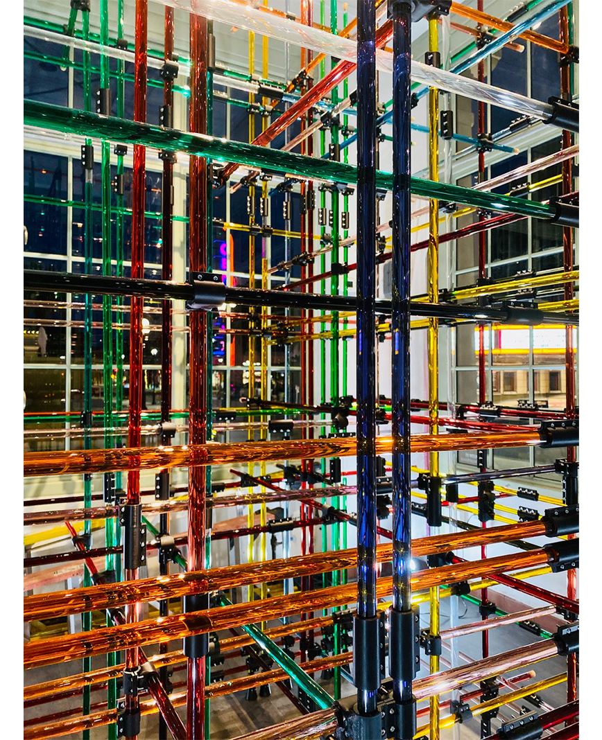 Virginia San Fratello was commissioned to create a new, site-specific installation for the Art Kiosk about the Bay Area. “Plaid” conflates the agricultural history of Santa Clara County with the contemporary technological focus of the region. The Plaid structure is composed of 300 state-of-the-art glass rods from Solyndra that are connected with 3D-printed nodes. The tubes are filled with liquids that represent some of the most prolific crops grown in the county including cabernet and chardonnay grapes, spinach, turmeric, oyster mushrooms, and spinach. The colorful tubes are woven together to create a festive 3-dimensional plaid structure that brings together the past and the future, high-tech and low-tech, liquid and light.