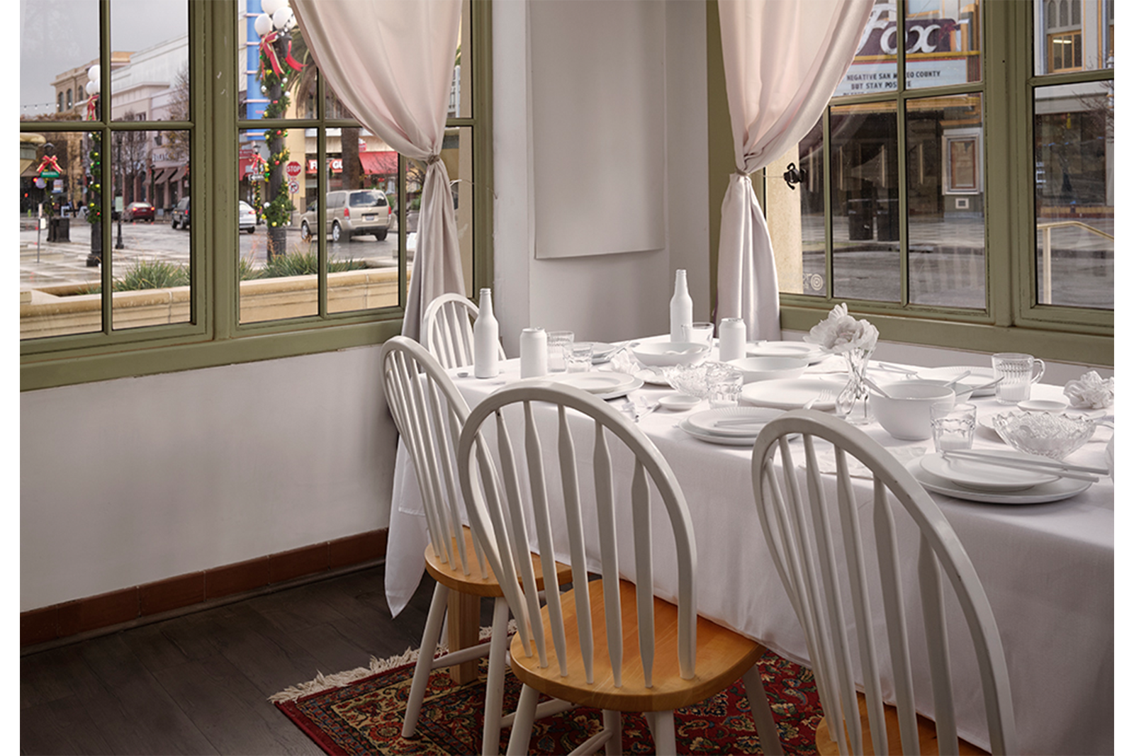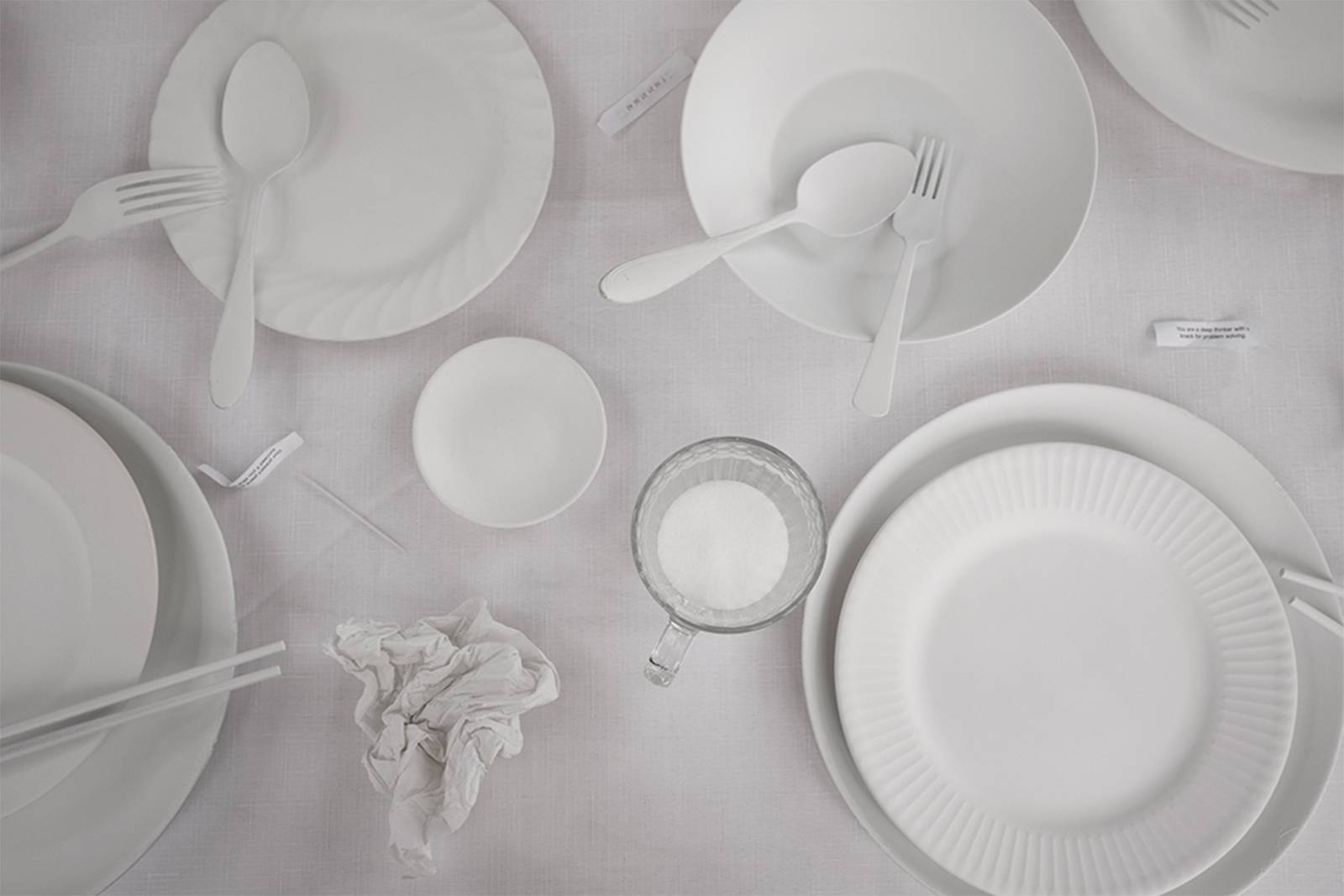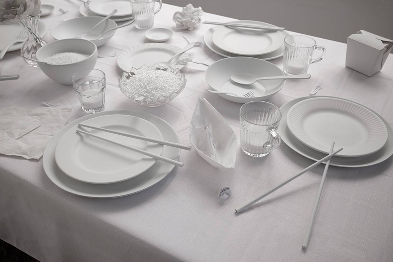 The installation resembles a quaint dining room, a table set for dinner, a television in the corner; and plants, books, and other knick knacks stacked on end tables along the walls. The table settings are coated in white paint and attached to a white tablecloth as though frozen in time, along with the remnants of a dinner party like crumpled napkins and ashtrays with cigarette butts.