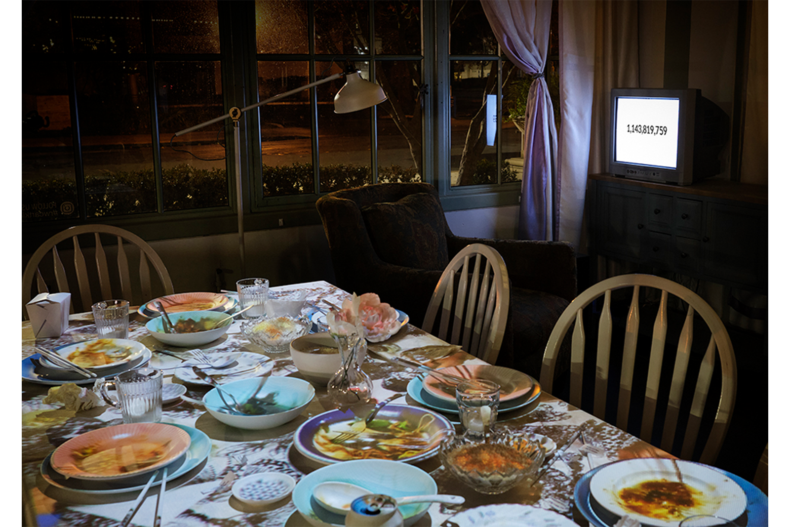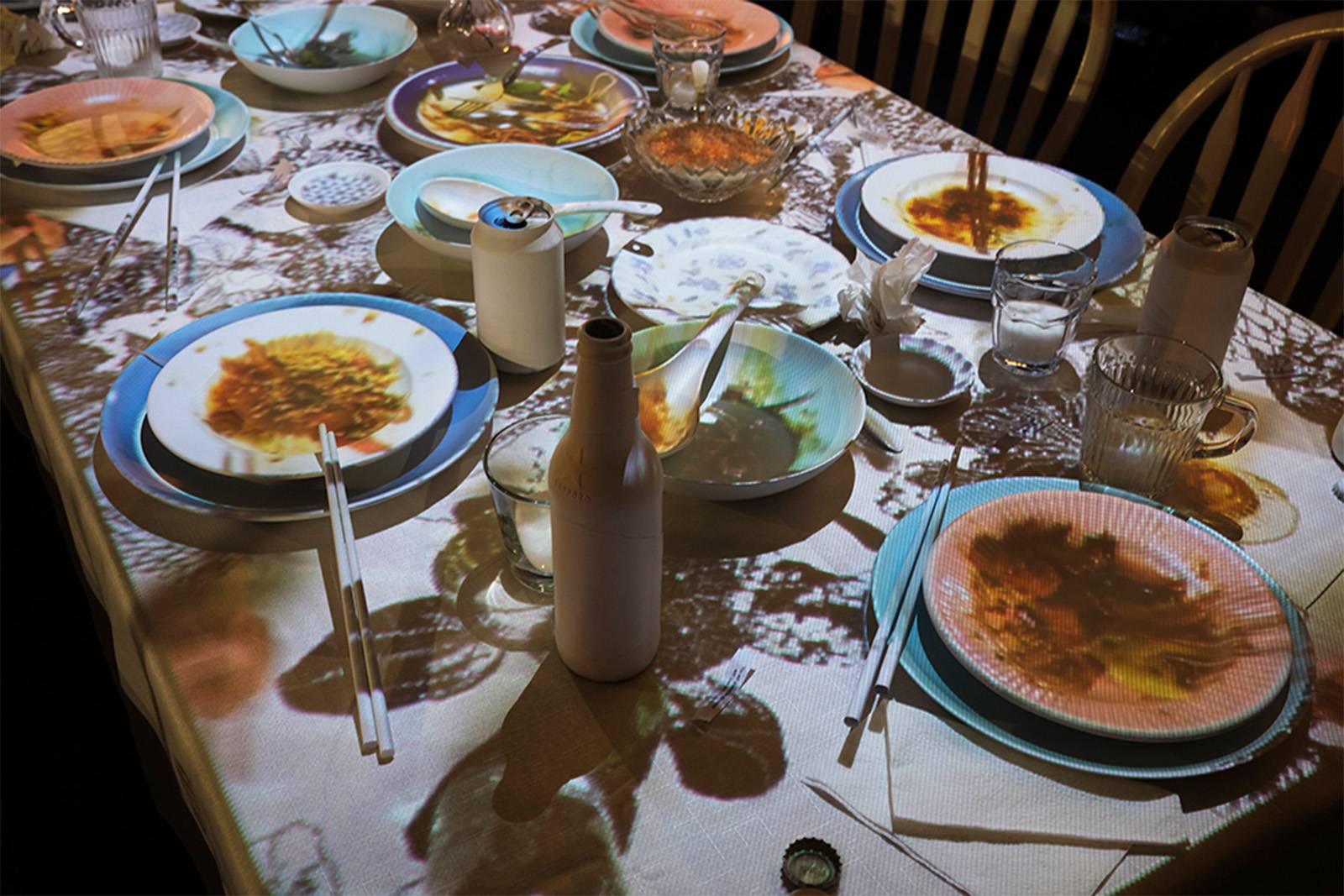 The installation resembles a quaint dining room, a table set for dinner, a television in the corner; and plants, books, and other knick knacks stacked on end tables along the walls. The table settings are coated in white paint and attached to a white tablecloth as though frozen in time, along with the remnants of a dinner party like crumpled napkins and ashtrays with cigarette butts. A projector angled downward displays a pre-recorded dinner party, precisely mapped to the blank canvas of the white table settings, creating an eerie combination of 3D objects and 2D projections interacting. Sounds of laughter, conversation, and music are faintly audible in the background, as though from a distant memory or a dream. The narrative is meant to evoke feelings of nostalgia—memories of dinners with friends and family, and celebrations of lives well lived.