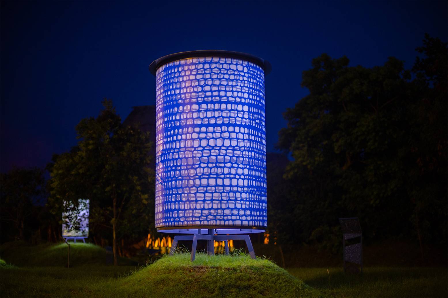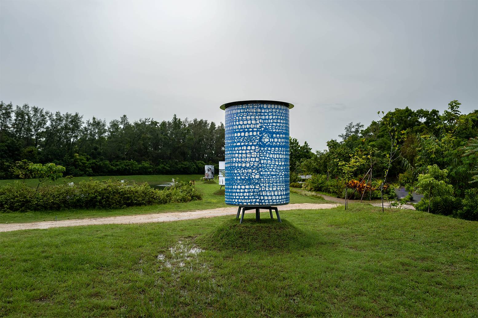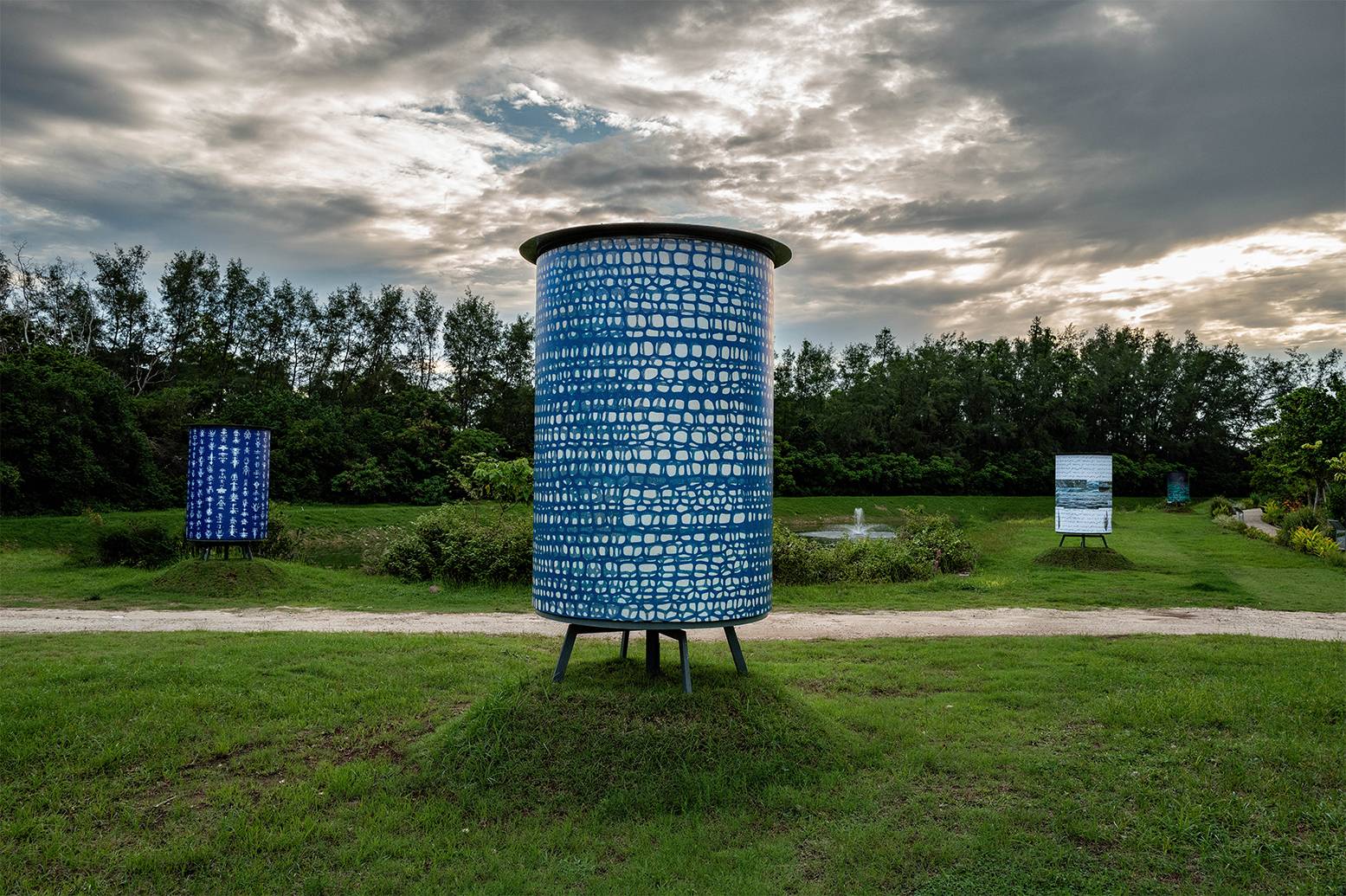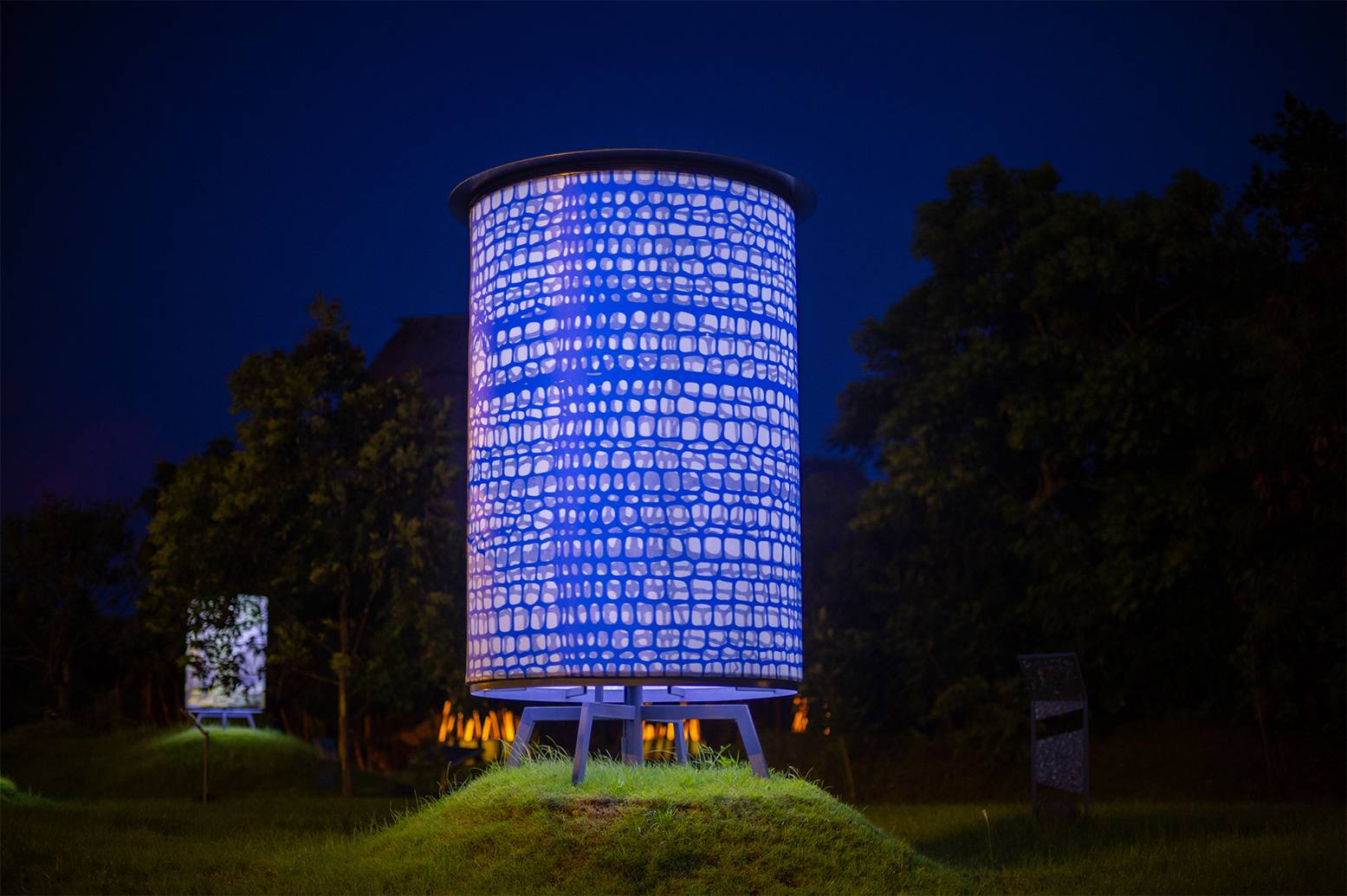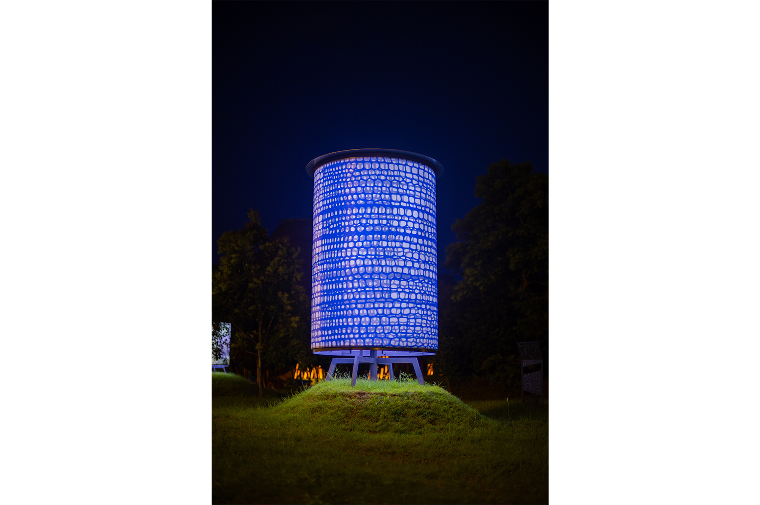 Interested in how scientists use tree rings to provide clues about past climate conditions, Abigail created Wai, a layered woodcut print depicting a microscopic view of tree ring patterns during wet and dry seasons. Essentially these intricate marks are a historical record of weather patterns over time. Wider rings signify abundant rain, while narrow rings indicate harsher conditions like drought. These carved lines memorialize a shift in climate affecting not only Hawaii but cherished environments all over the world.