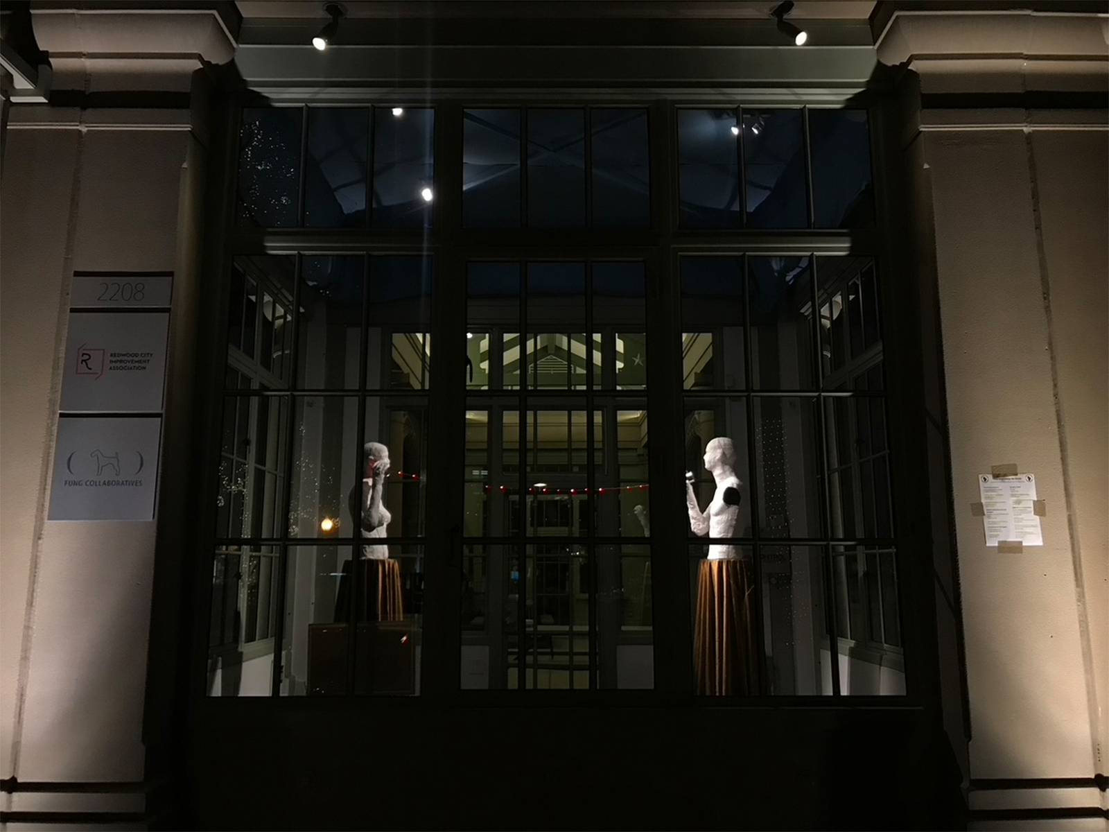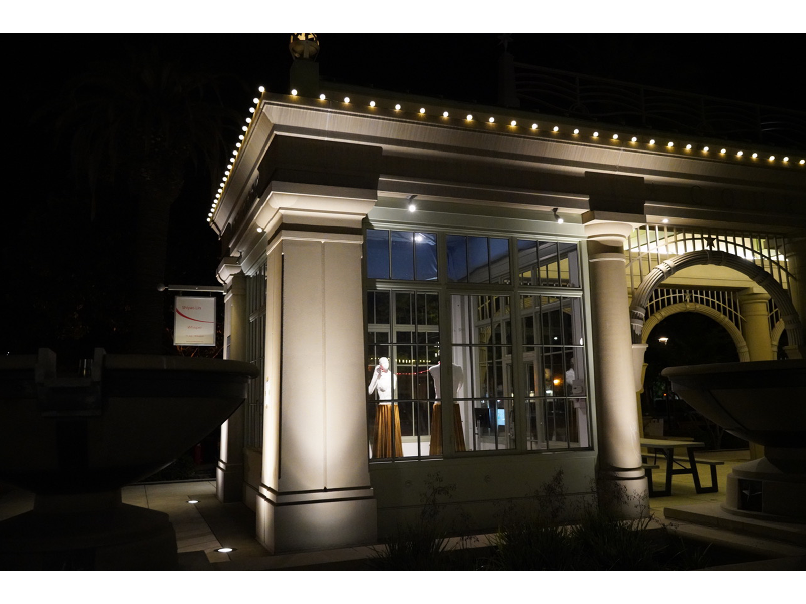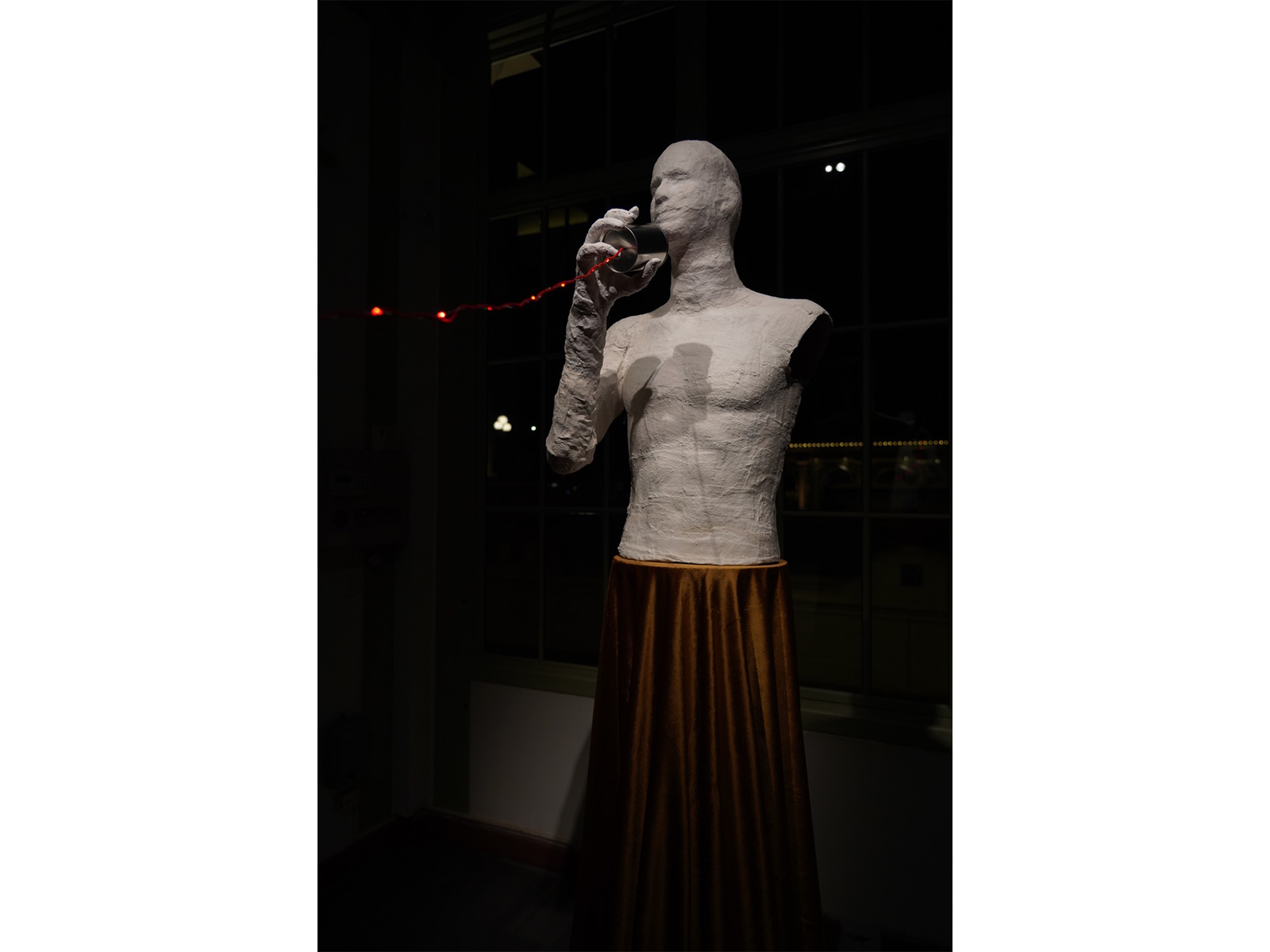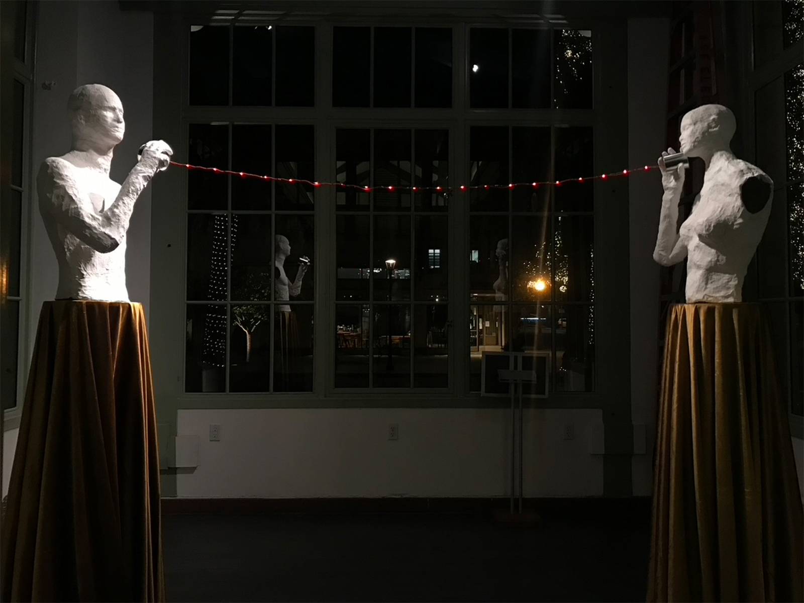 Whisper is an installation consisting of two figurative sculptures: a male and a female. The two figures are set six feet apart and facing each other – a response to social distancing. Meanwhile, the distant figures are connected by a red string and two metal cans between them which is known as tin can telephones; an acoustic voice-transmitting game often played by children. Lin intends to bring a child-like innocence into the adult conversation. No matter the age of people, the connection between them are still young and pure like the red string metaphor. A red fairy light strand is attached to the string so the connection between the two figures will twinkle at night.