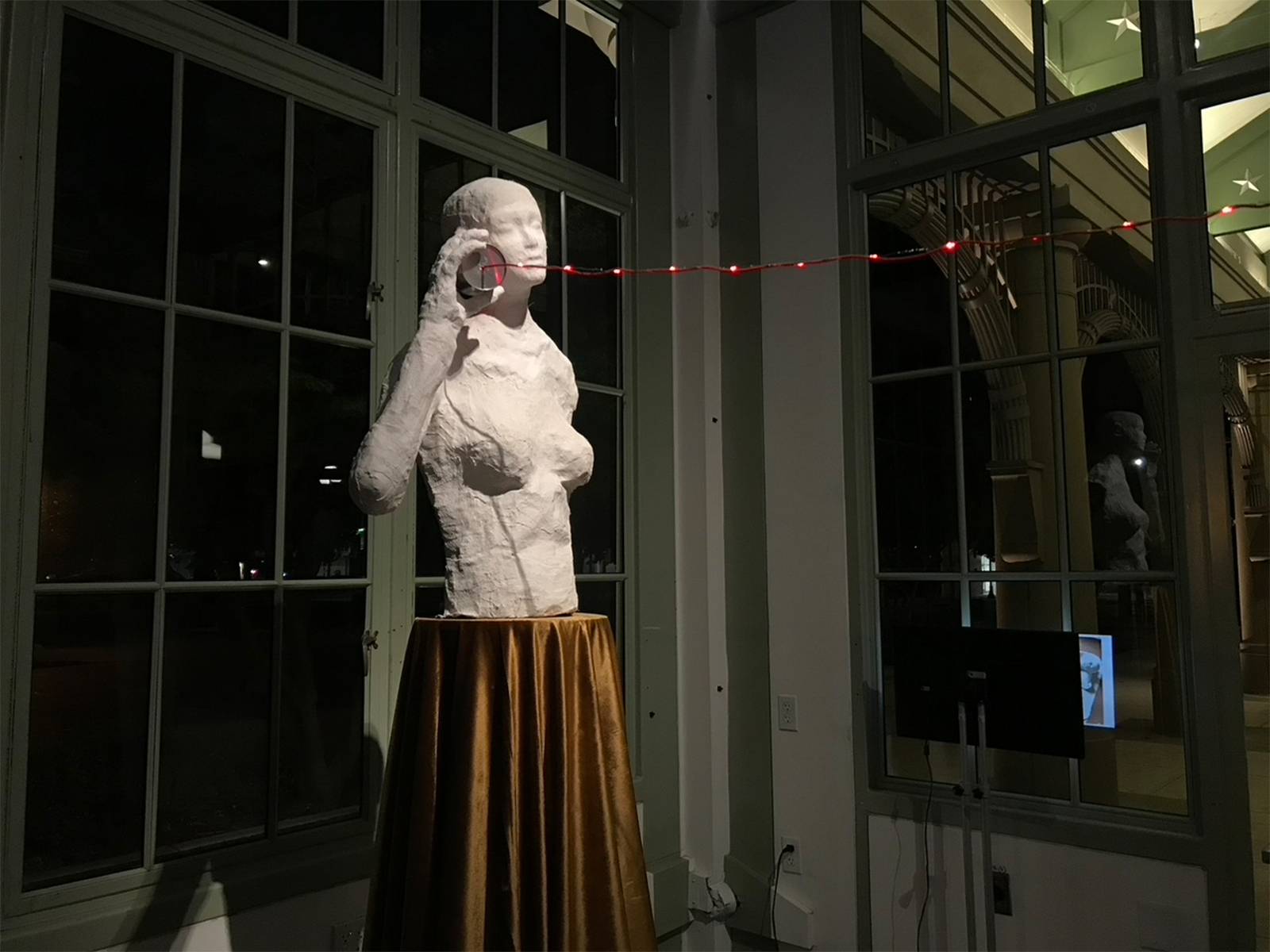 The two figures are both left intentionally unpolished, each one of them missing one arm, and the audience can look at the hollowness inside of them. This symbolizes flaws within each of us and represents we are incomplete as individuals when being isolated and separate from human connection. The two sculptures are placed on golden pedestals with luxurious velvet fabric. The gold harkens to romance and a shimmering light. The artist raises the sculptures above eye level as she wants to arouse a feeling of worship for the precious connection between human beings.
