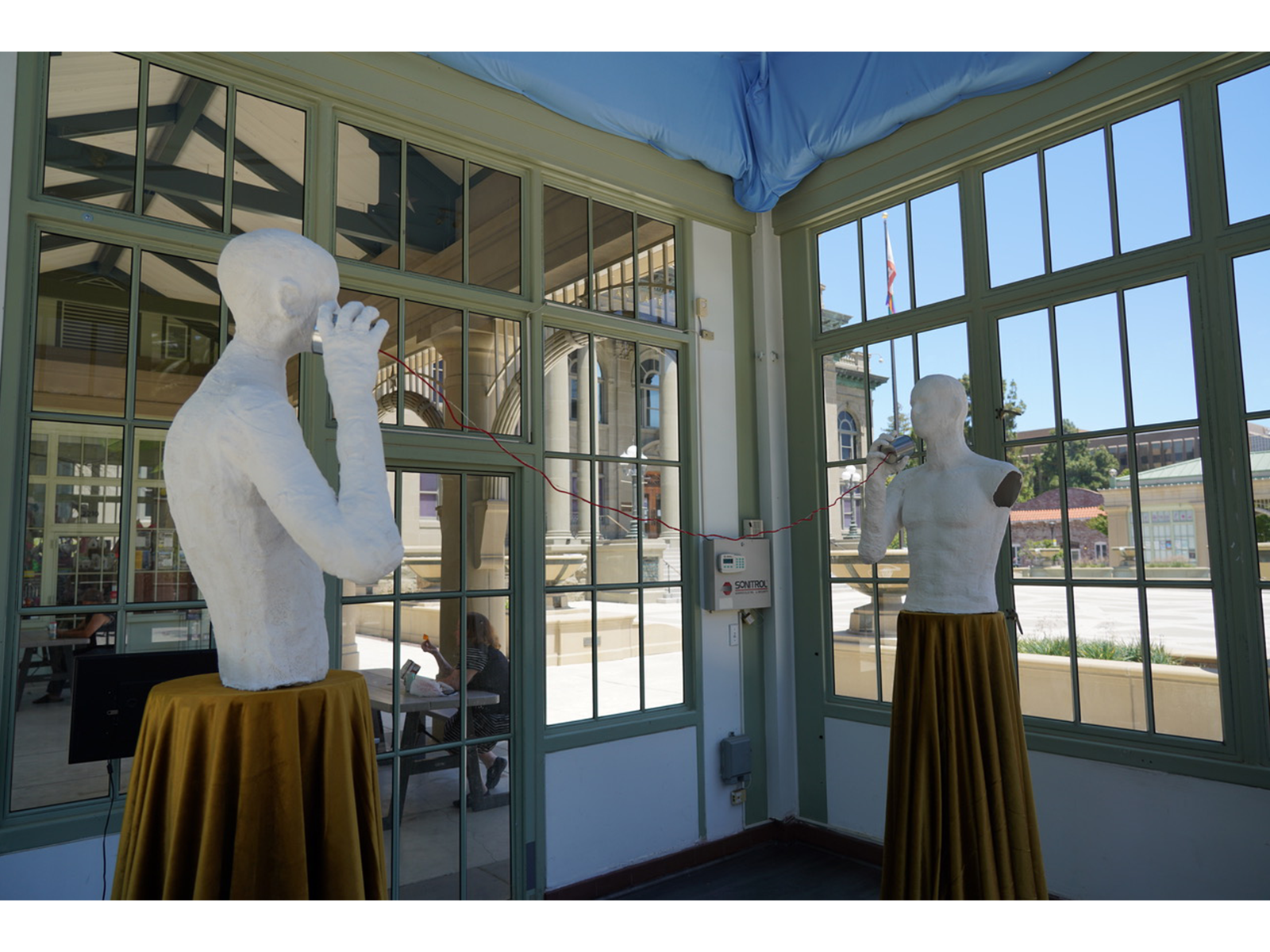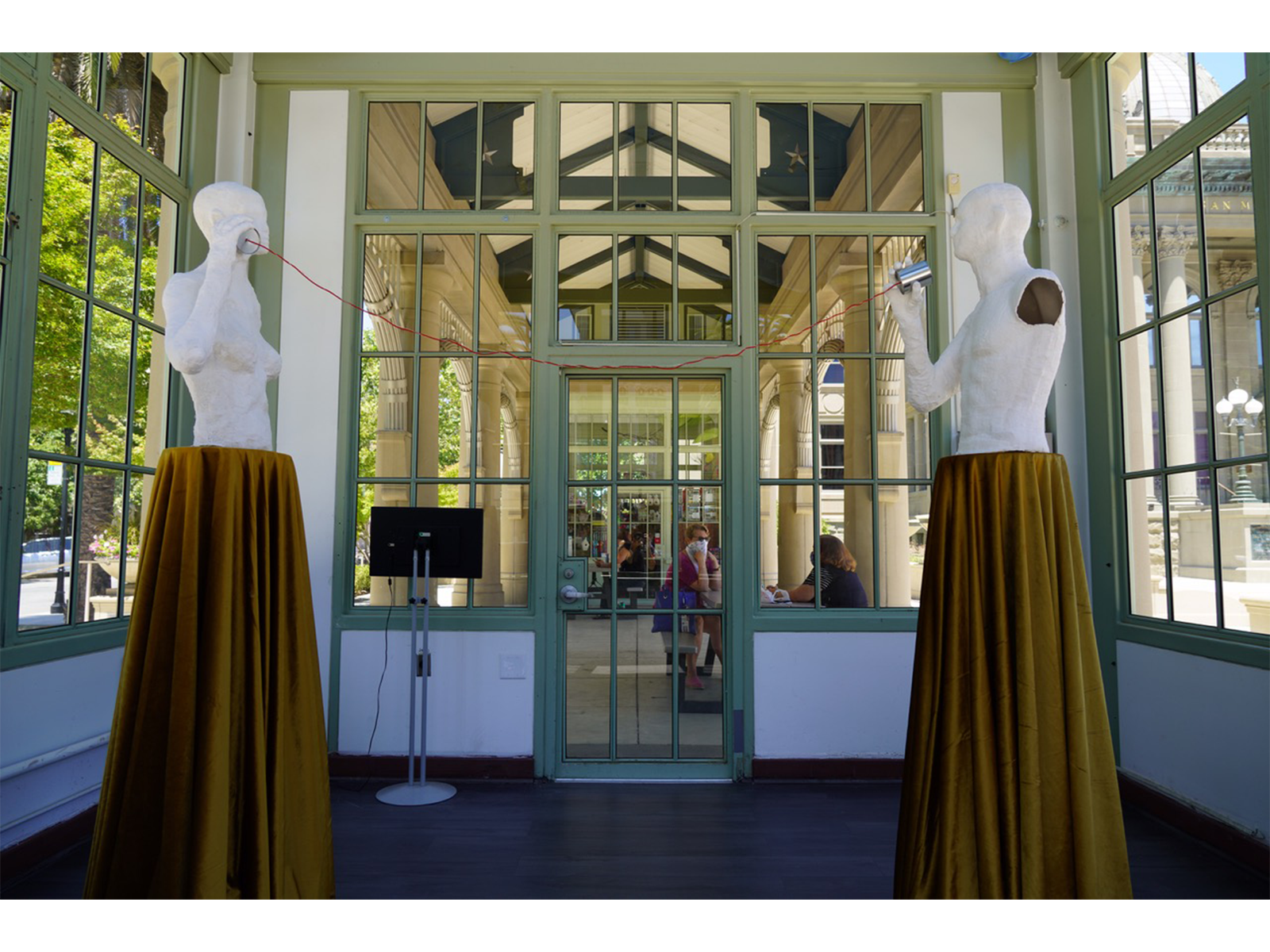 Whisper is an installation consisting of two figurative sculptures: a male and a female. The two figures are set six feet apart and facing each other – a response to social distancing. Meanwhile, the distant figures are connected by a red string and two metal cans between them which is known as tin can telephones; an acoustic voice-transmitting game often played by children. Lin intends to bring a child-like innocence into the adult conversation.