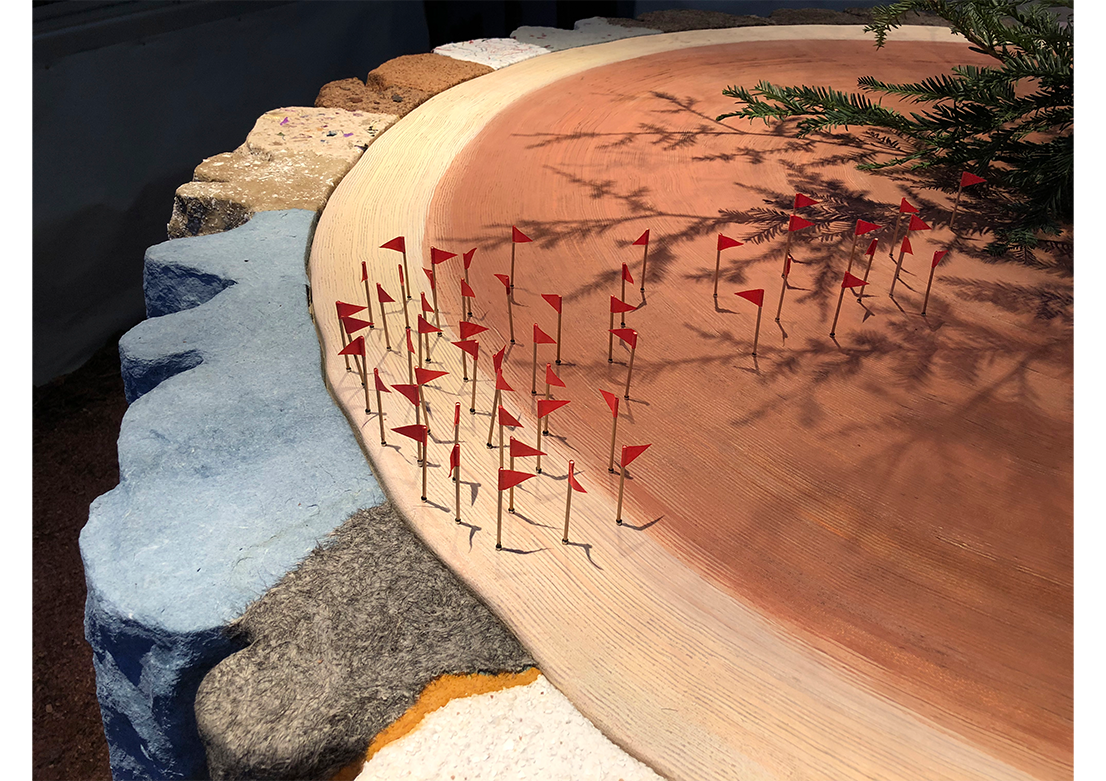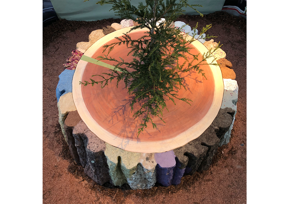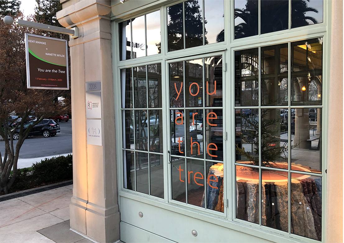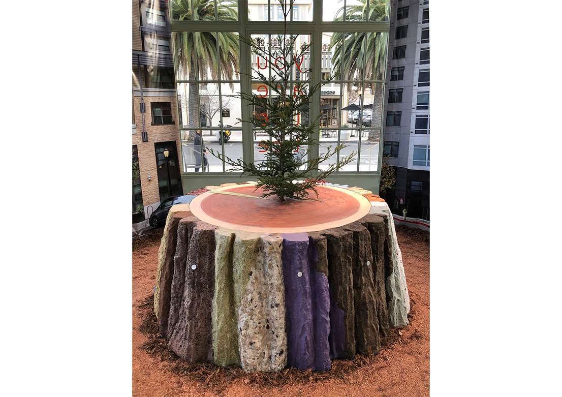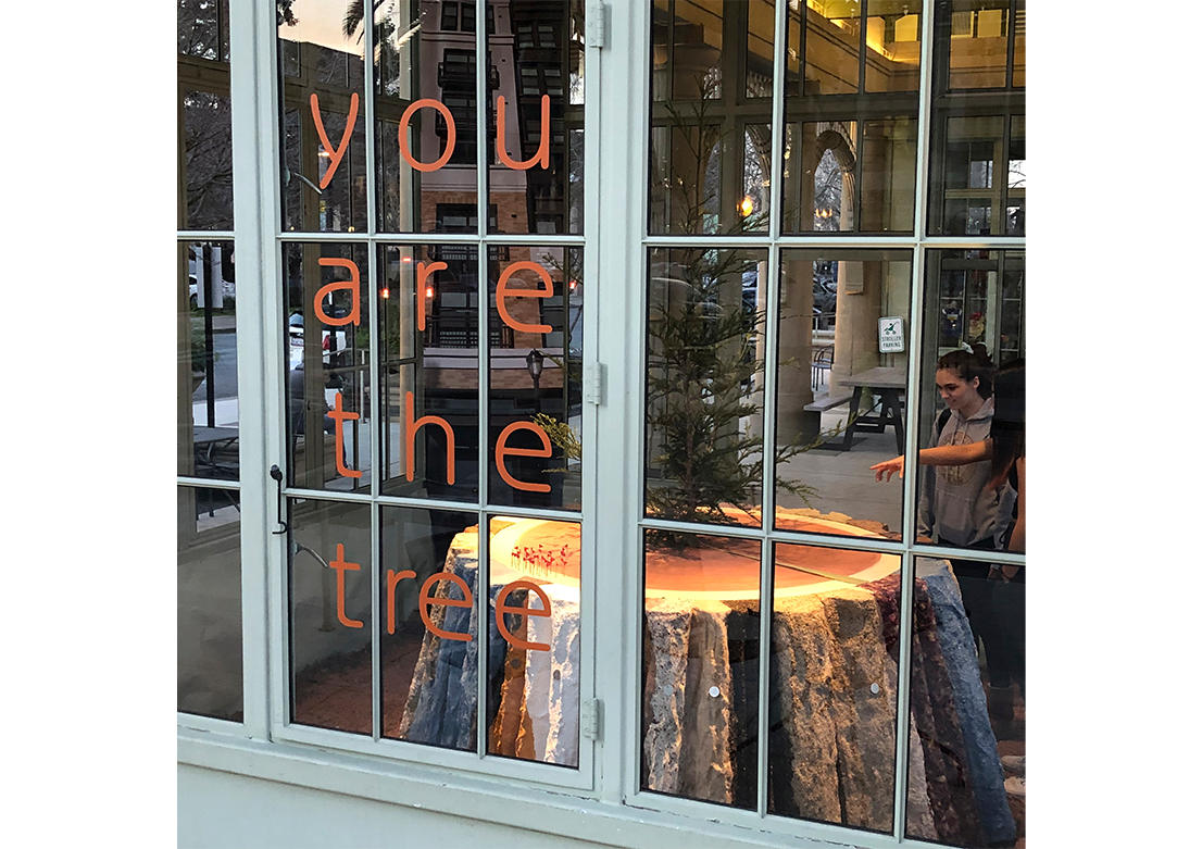 Centered on the floor of the kiosk is a seven-foot diameter replica of an old growth, coast redwood tree stump. The stump's multi-colored and highly textured bark alludes to the beauty and value of human and environmental diversity. Concentric growth rings are visible on the surface of the stump. Small flags mark significant disruptive invention events which occurred during the last 1000 years, the lifespan of the tree. A living redwood tree sprouts from the stump's center. For the Redwood City installation, photographic slices of Redwood City's new residential high-rise buildings tower in each of the glass kiosk's four corners. Through the windows, landmark buildings, including the Fox Theatre and the former San Mateo County Courthouse, are visible. The kiosk windows contain four words: you are the tree.