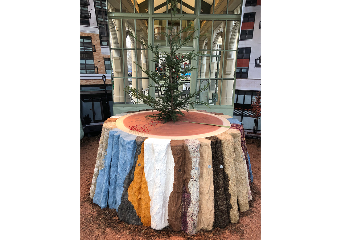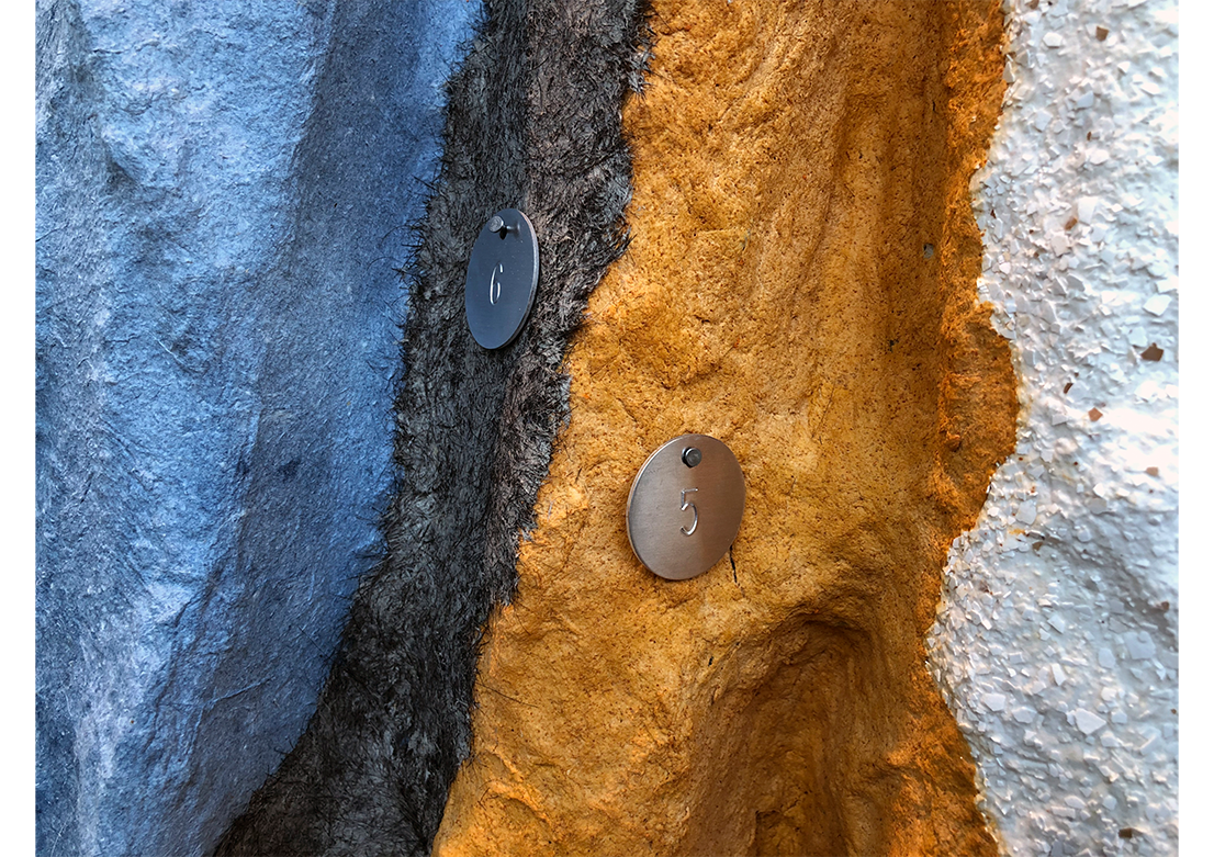 This handcrafted paper pulp assembly was made from locally sourced, Redwood City, craft industry byproducts such as spent beer grains, eggshells, fabric scraps, flower parts and hair. The twenty-five unique bark sections are tagged with legacy tree markers to identify both merchant and byproduct. Each section celebrates local labor and honors people who make things with their hands.
